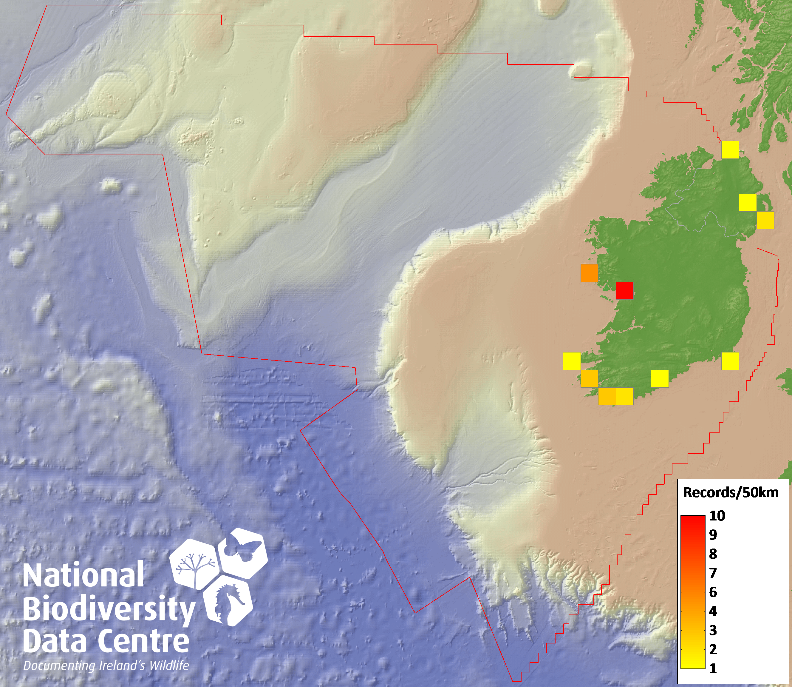 Distribution of the number of records recorded within each 10km grid square (ITM).Marine Map - 50km