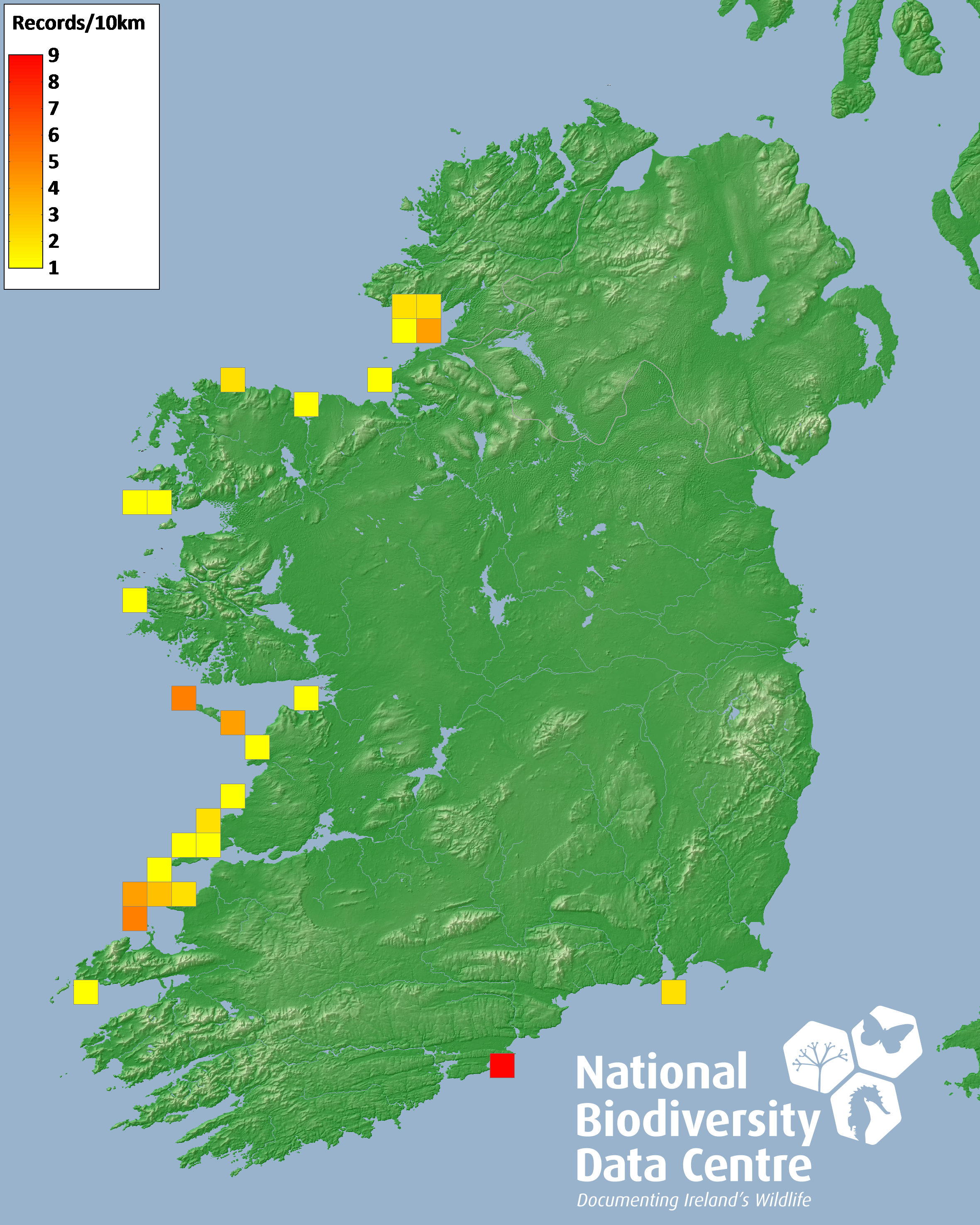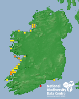 Distribution of the number of records recorded within each 10km grid square (ITM).Marine Map - 50km