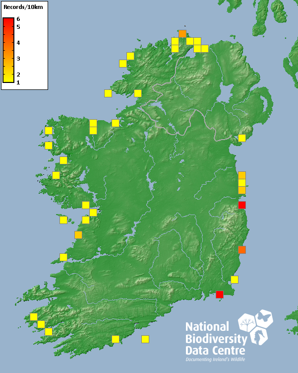 Distribution of the number of records recorded within each 10km grid square (ITM).Marine Map - 50km