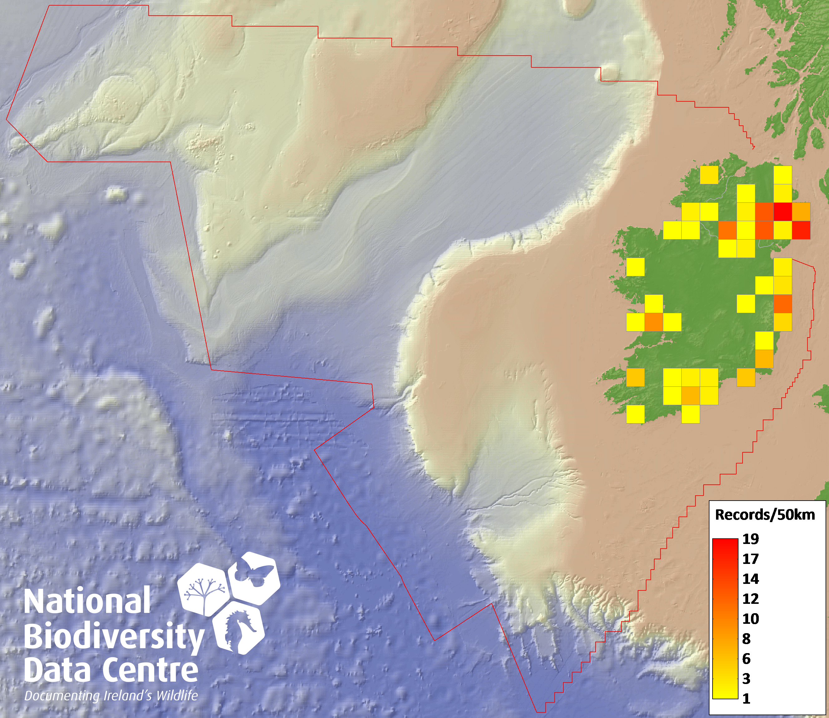 Distribution of the number of records recorded within each 10km grid square (ITM).Marine Map - 50km
