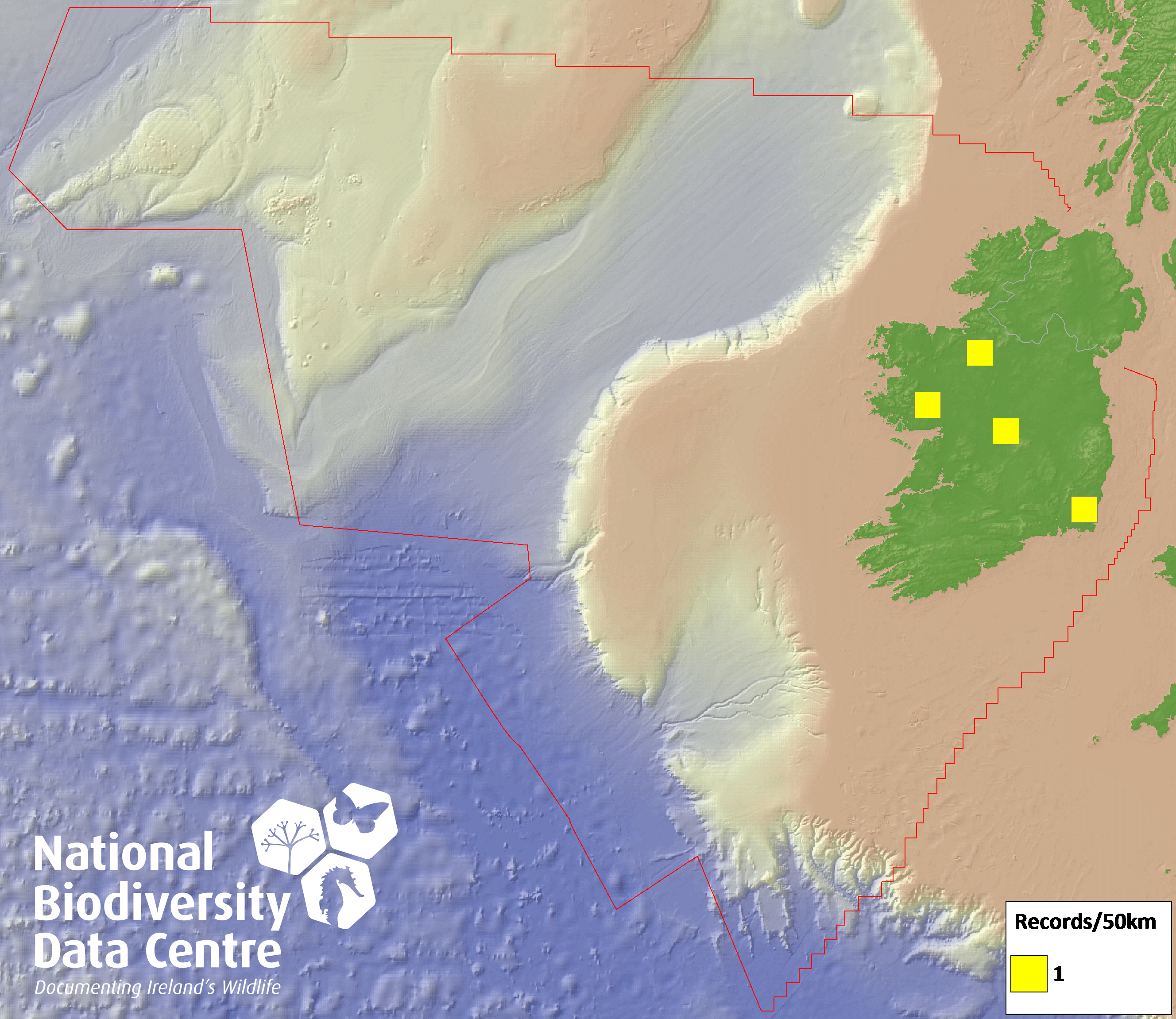 Distribution of the number of records recorded within each 10km grid square (ITM).Marine Map - 50km