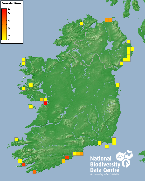 Distribution of the number of records recorded within each 10km grid square (ITM).Marine Map - 50km