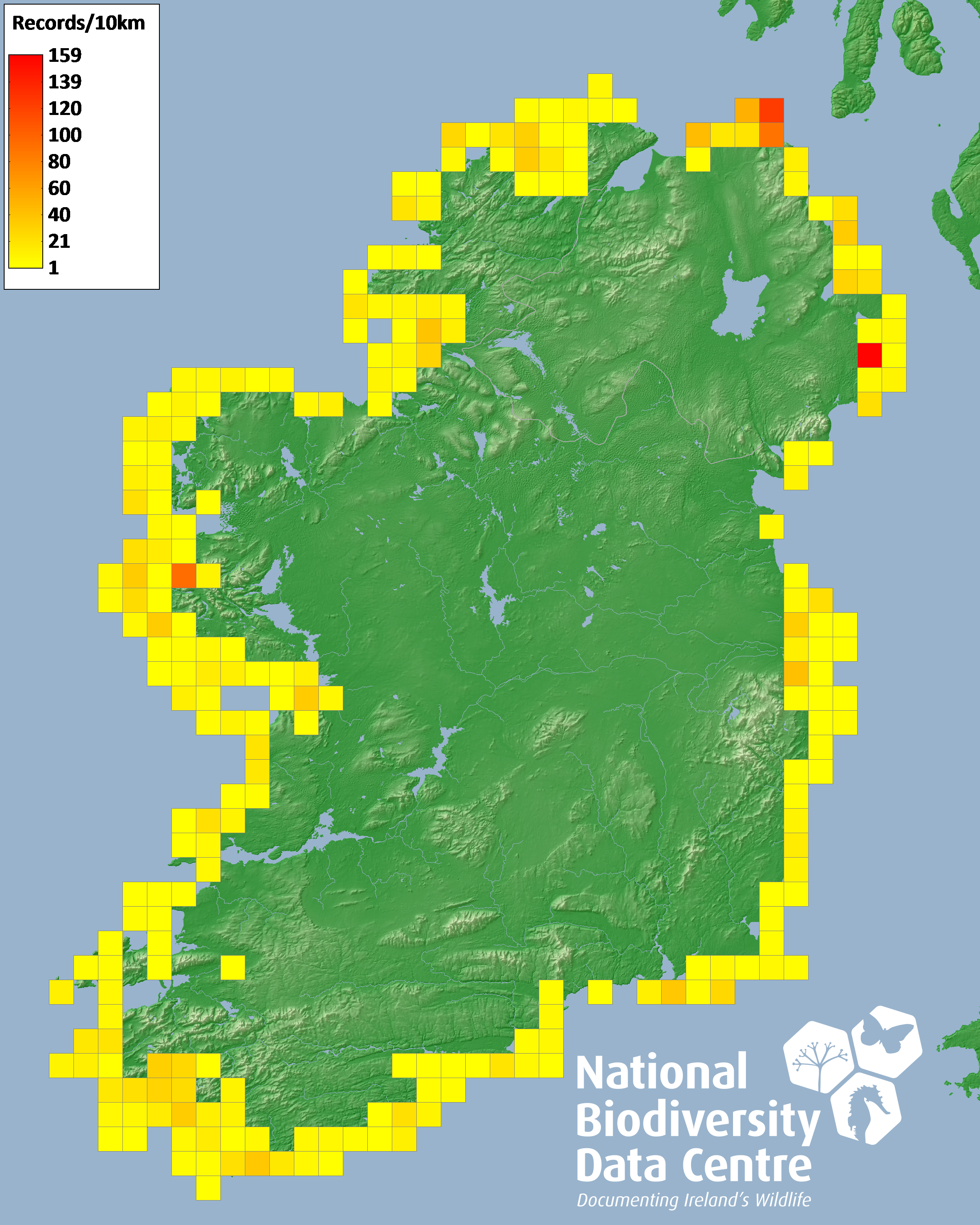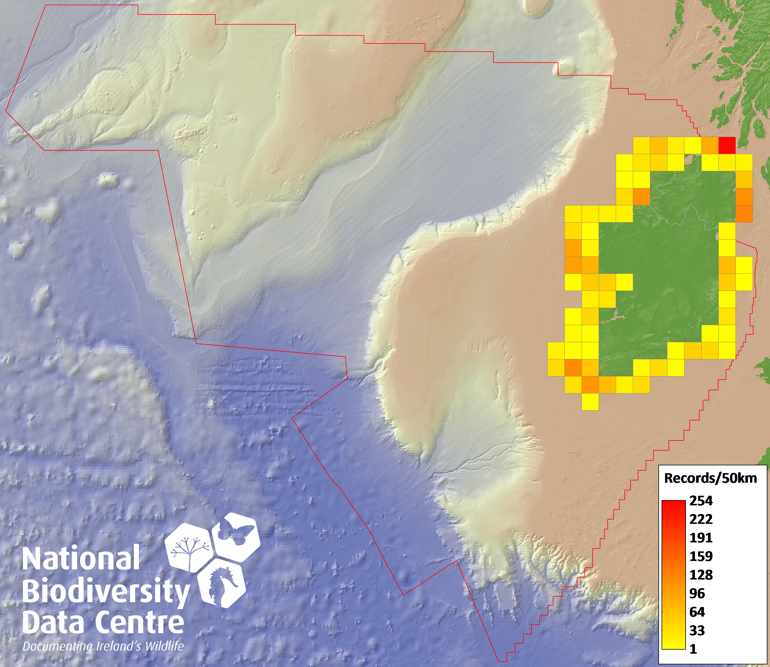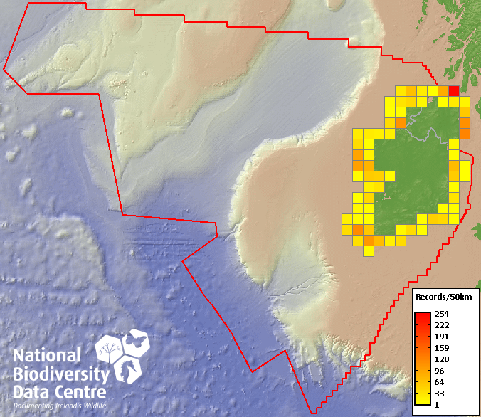 Distribution of the number of records recorded within each 10km grid square (ITM).Marine Map - 50km