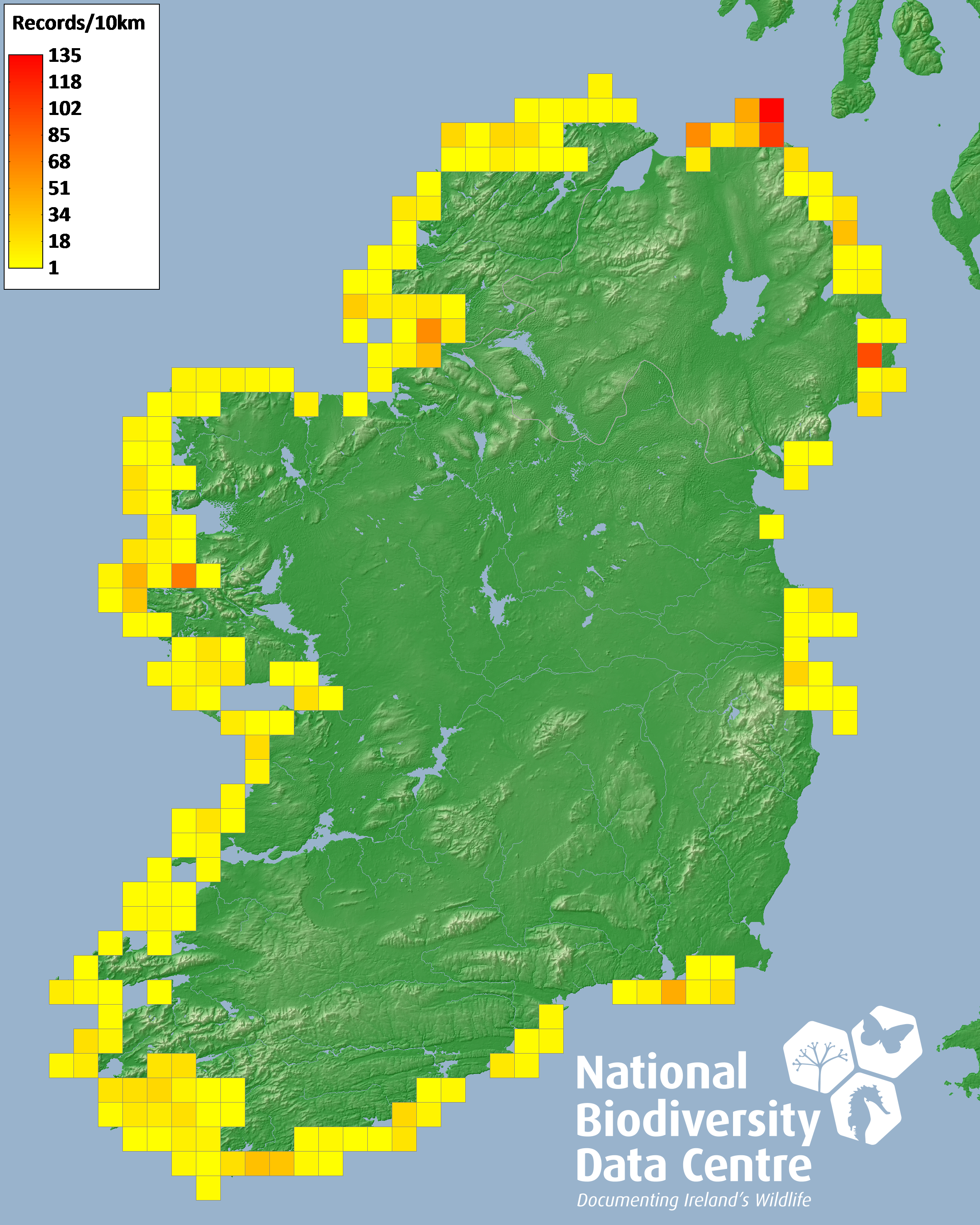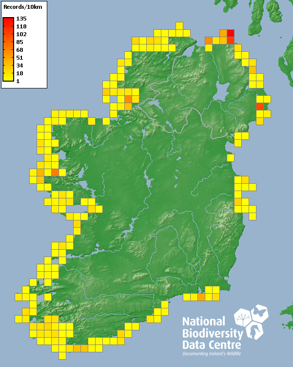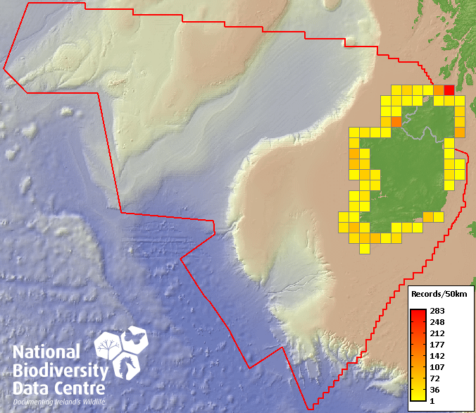 Distribution of the number of records recorded within each 10km grid square (ITM).Marine Map - 50km