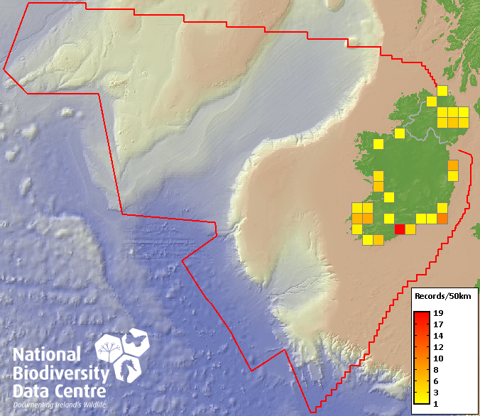 Distribution of the number of records recorded within each 10km grid square (ITM).Marine Map - 50km