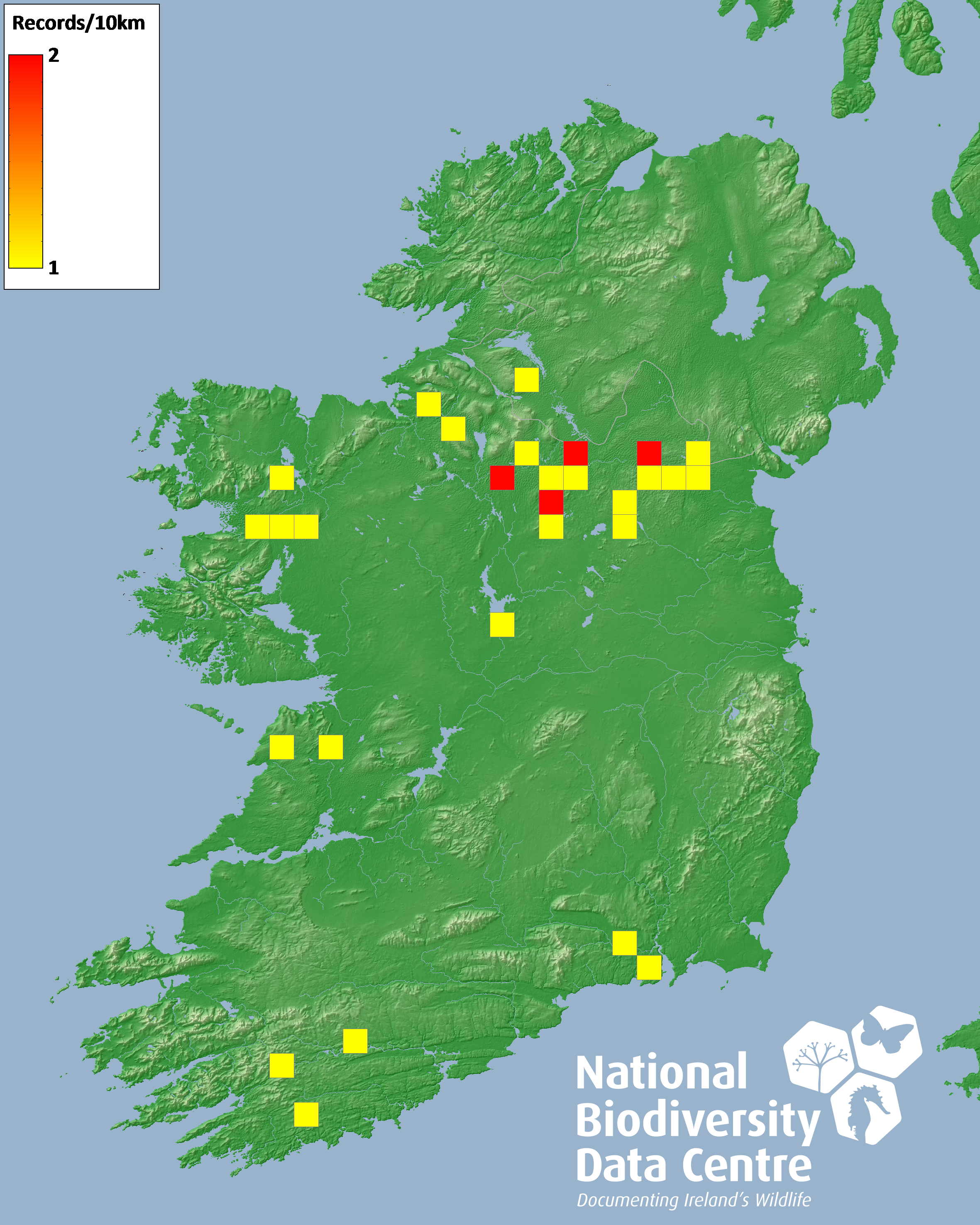 Distribution of the number of records recorded within each 10km grid square (ITM).Marine Map - 50km