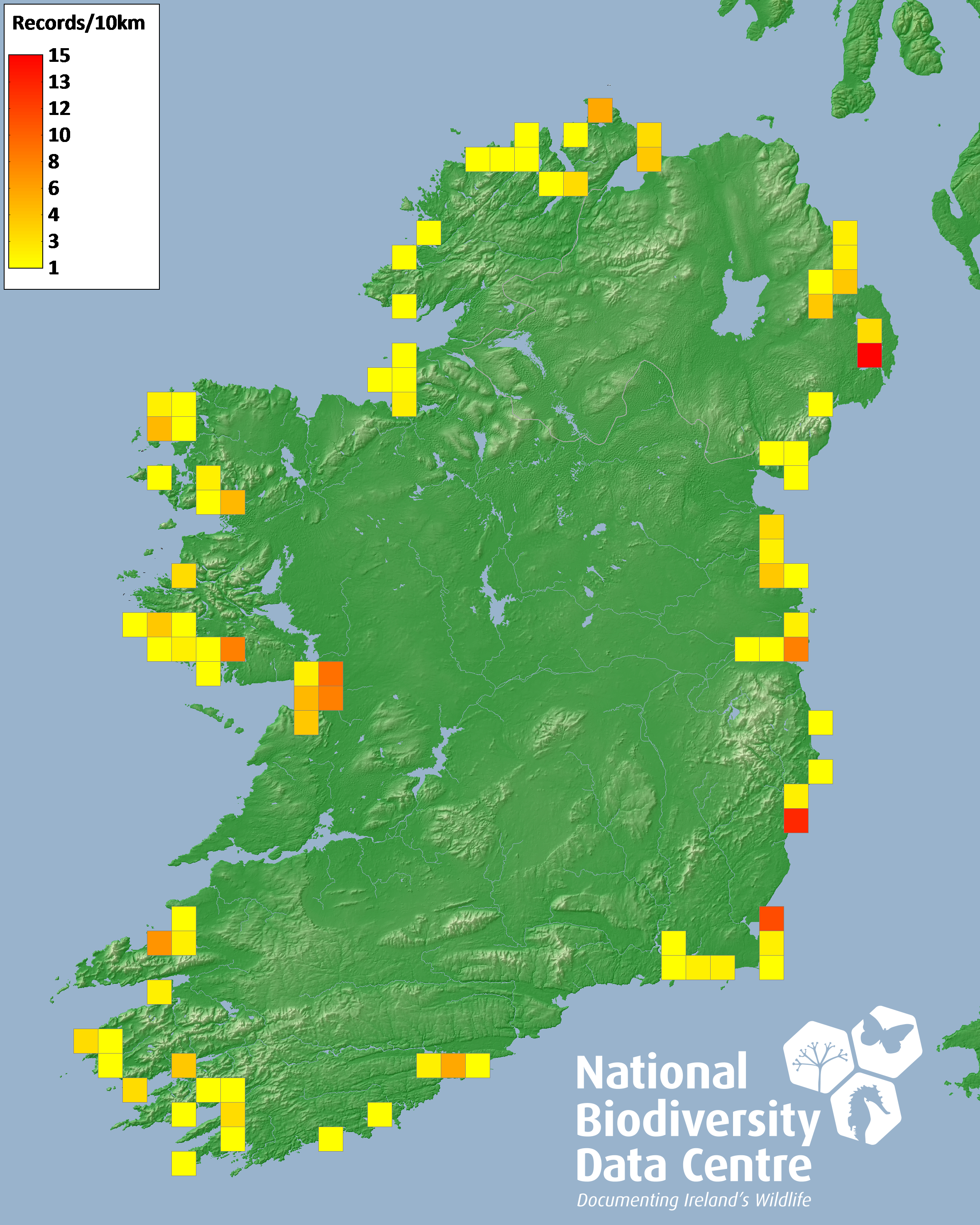 Distribution of the number of records recorded within each 10km grid square (ITM).Marine Map - 50km