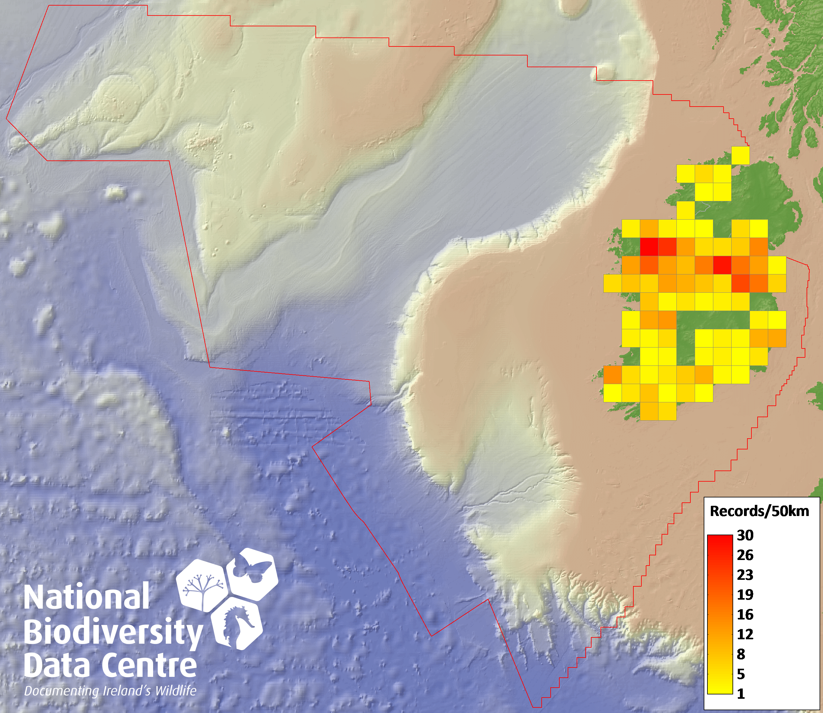 Distribution of the number of records recorded within each 10km grid square (ITM).Marine Map - 50km