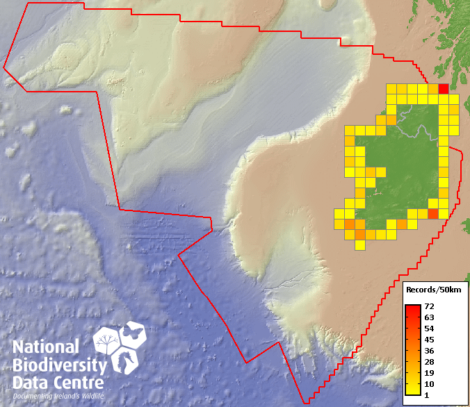 Distribution of the number of records recorded within each 10km grid square (ITM).Marine Map - 50km