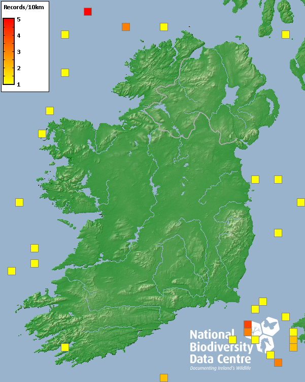 Distribution of the number of records recorded within each 10km grid square (ITM).Marine Map - 50km