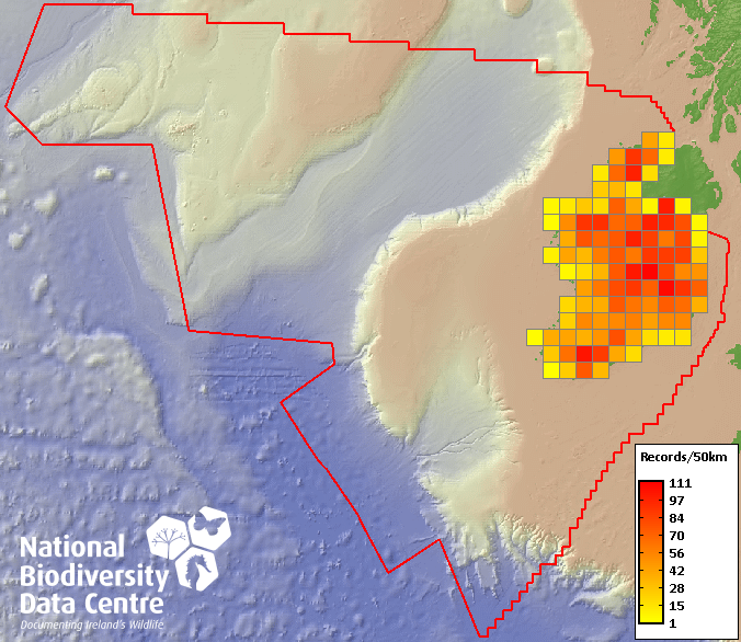 Distribution of the number of records recorded within each 10km grid square (ITM).Marine Map - 50km