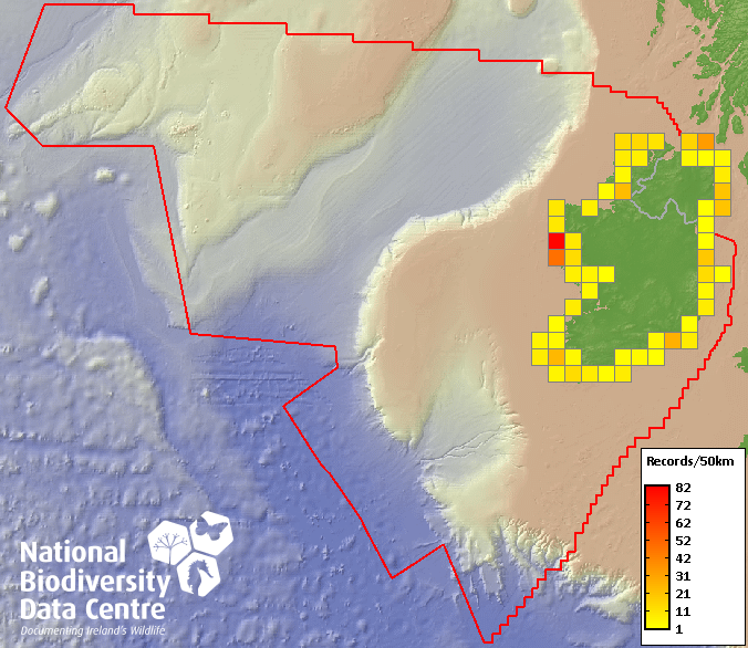 Distribution of the number of records recorded within each 10km grid square (ITM).Marine Map - 50km