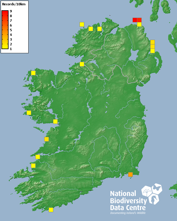 Distribution of the number of records recorded within each 10km grid square (ITM).Marine Map - 50km