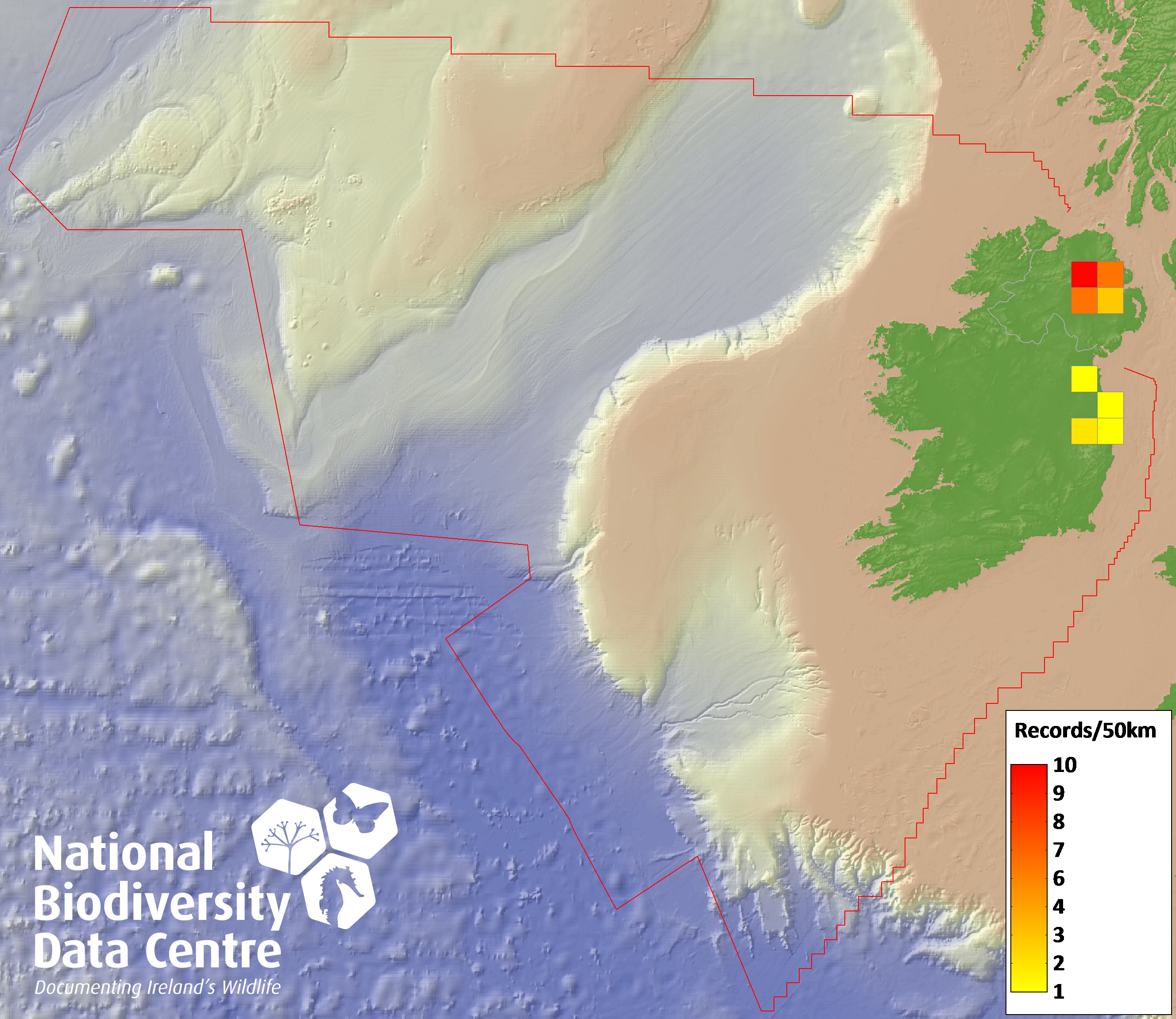 Distribution of the number of records recorded within each 10km grid square (ITM).Marine Map - 50km