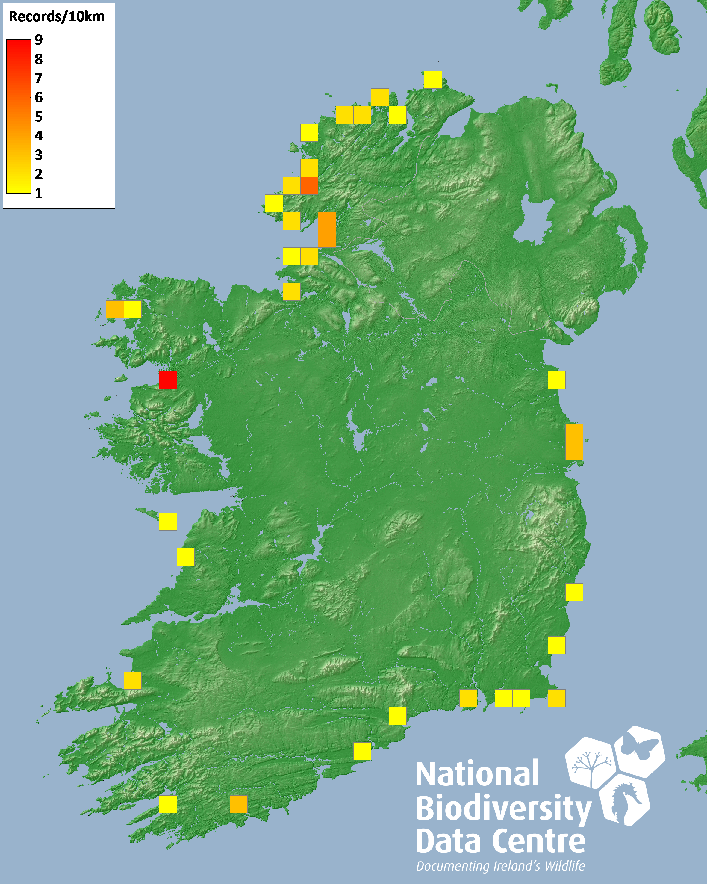 Distribution of the number of records recorded within each 10km grid square (ITM).Marine Map - 50km