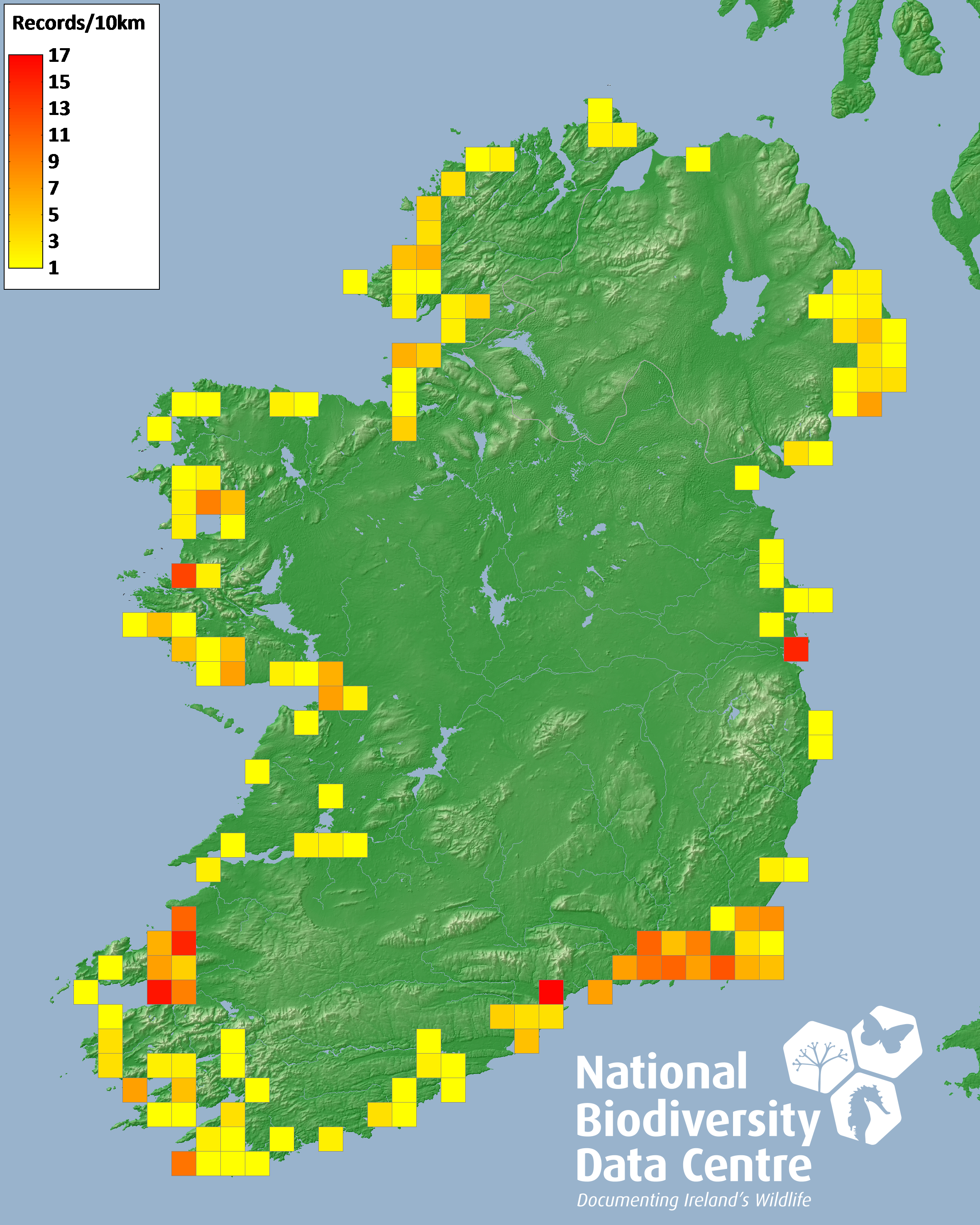 Distribution of the number of records recorded within each 10km grid square (ITM).Marine Map - 50km