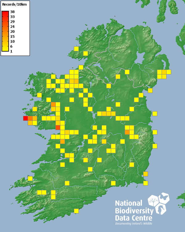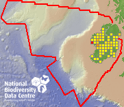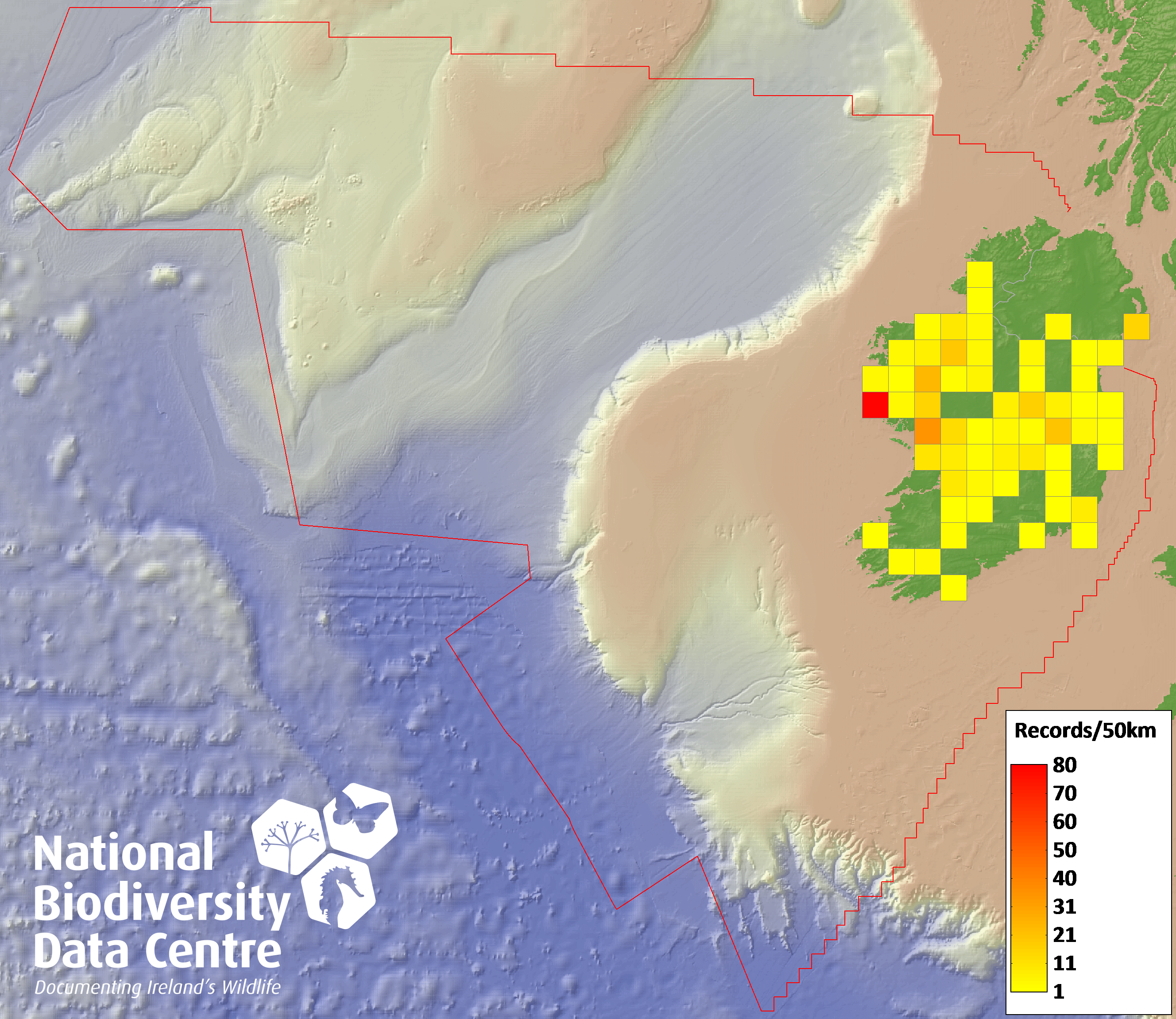 Distribution of the number of records recorded within each 10km grid square (ITM).Marine Map - 50km