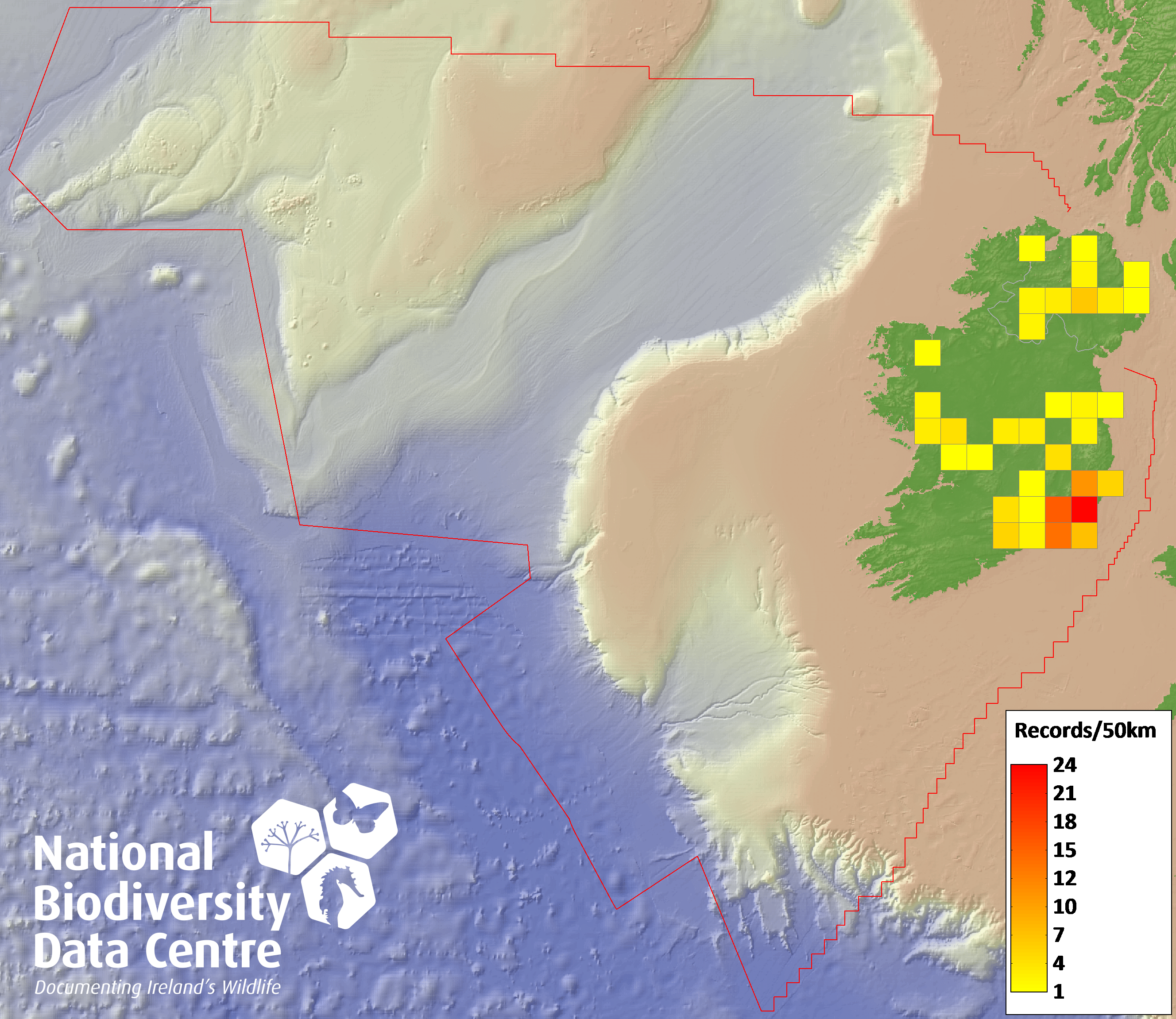 Distribution of the number of records recorded within each 10km grid square (ITM).Marine Map - 50km
