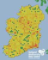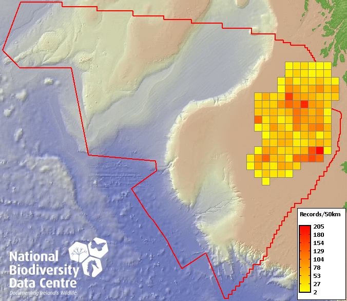 Distribution of the number of records recorded within each 10km grid square (ITM).Marine Map - 50km