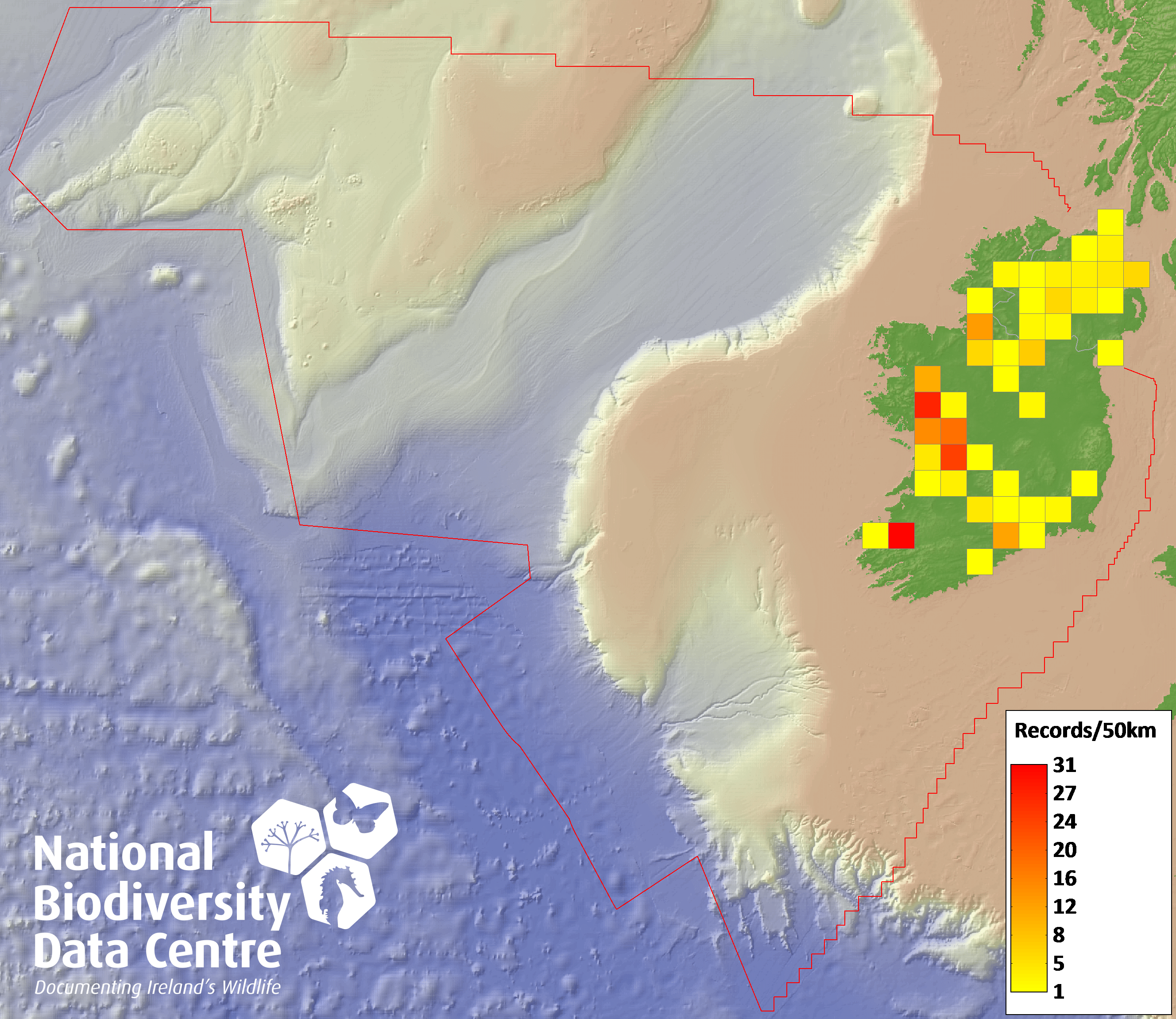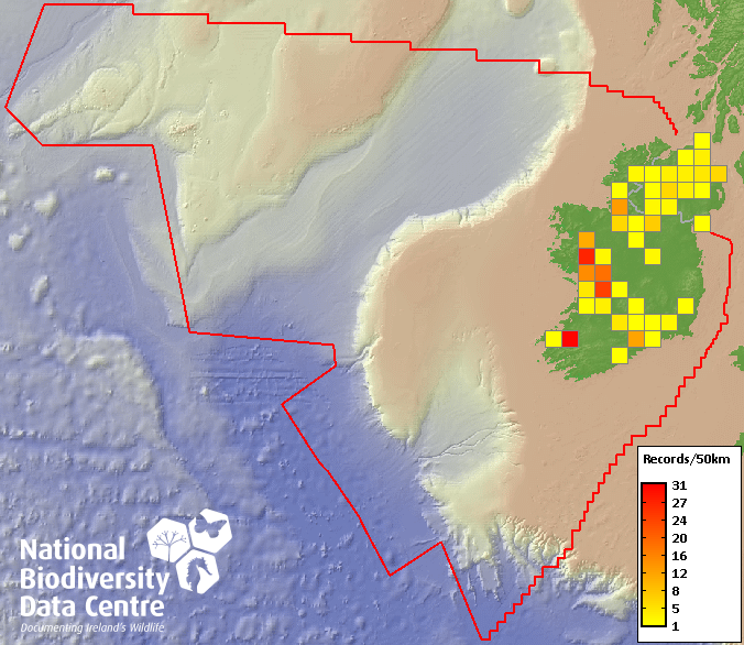 Distribution of the number of records recorded within each 10km grid square (ITM).Marine Map - 50km