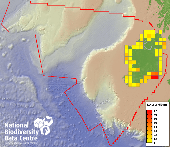 Distribution of the number of records recorded within each 10km grid square (ITM).Marine Map - 50km
