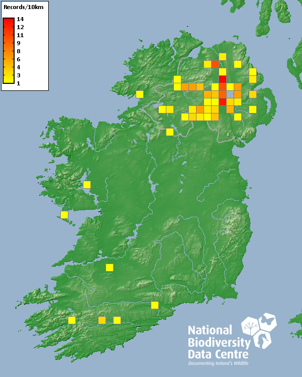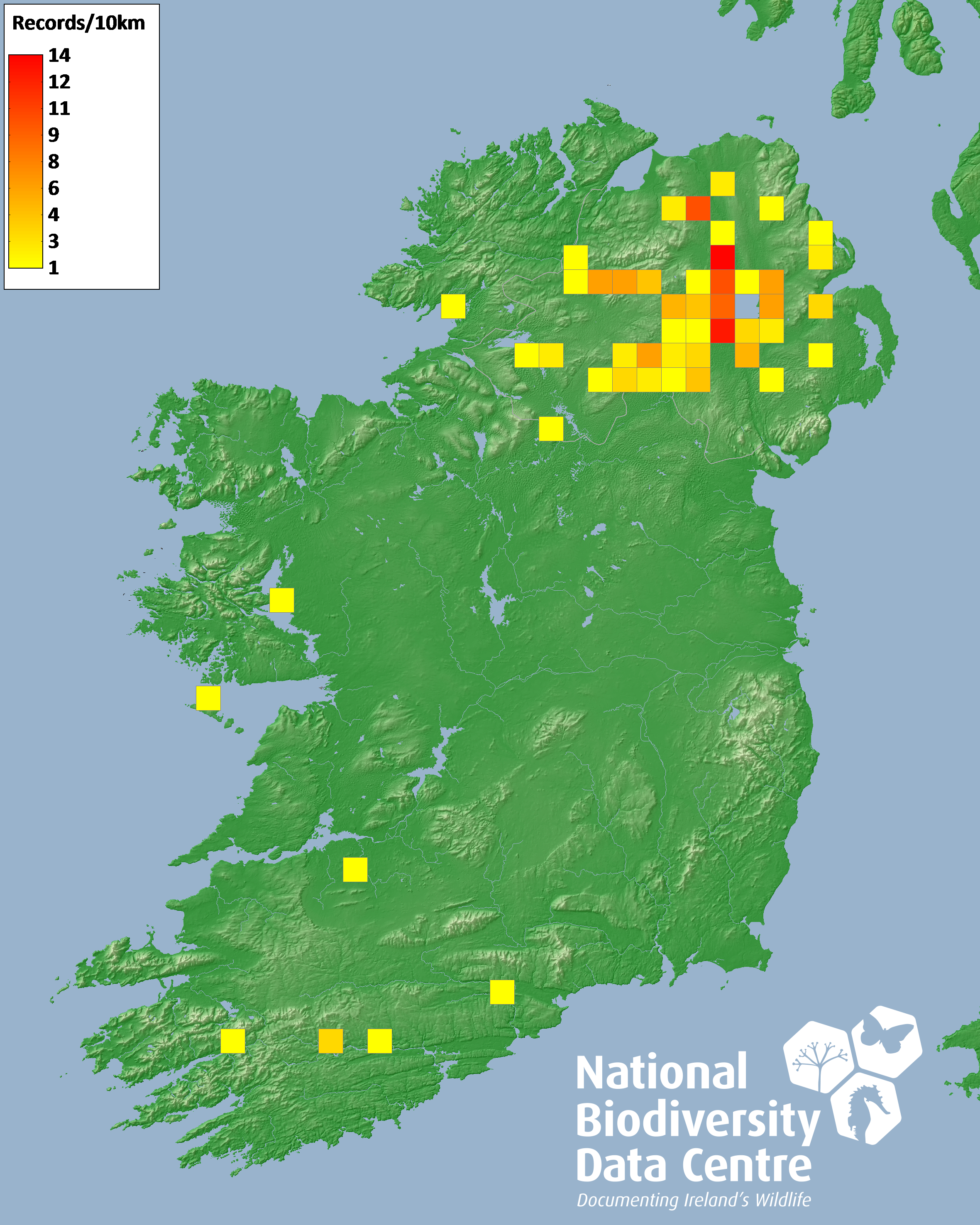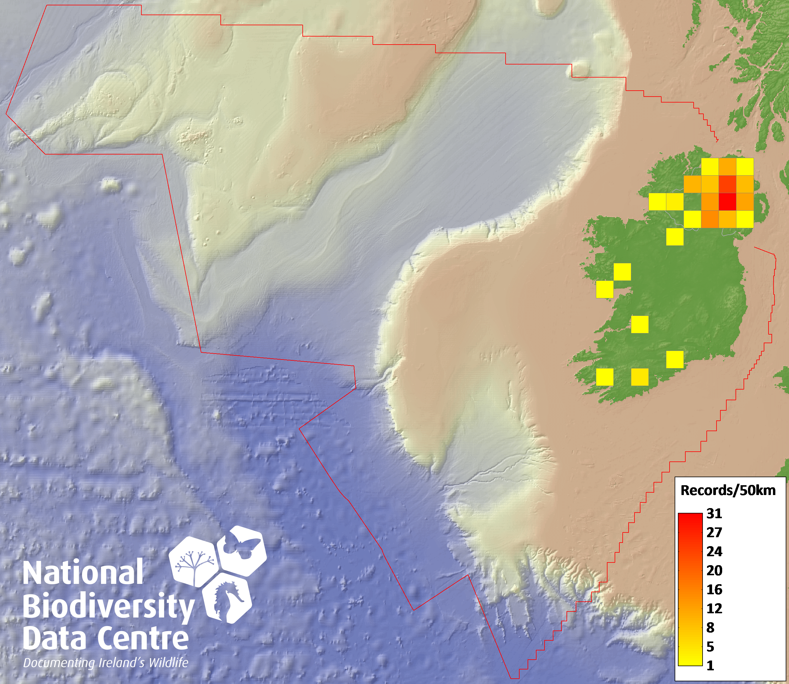 Distribution of the number of records recorded within each 10km grid square (ITM).Marine Map - 50km