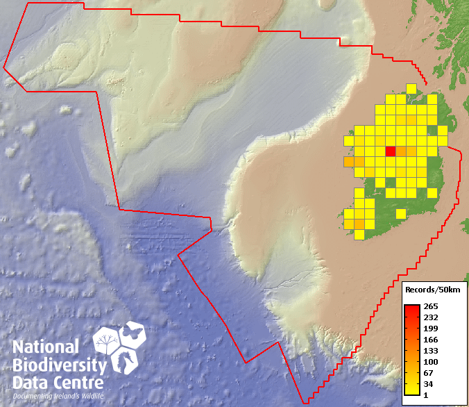 Distribution of the number of records recorded within each 10km grid square (ITM).Marine Map - 50km