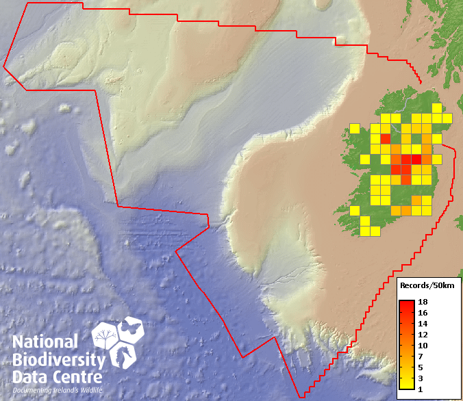 Distribution of the number of records recorded within each 10km grid square (ITM).Marine Map - 50km