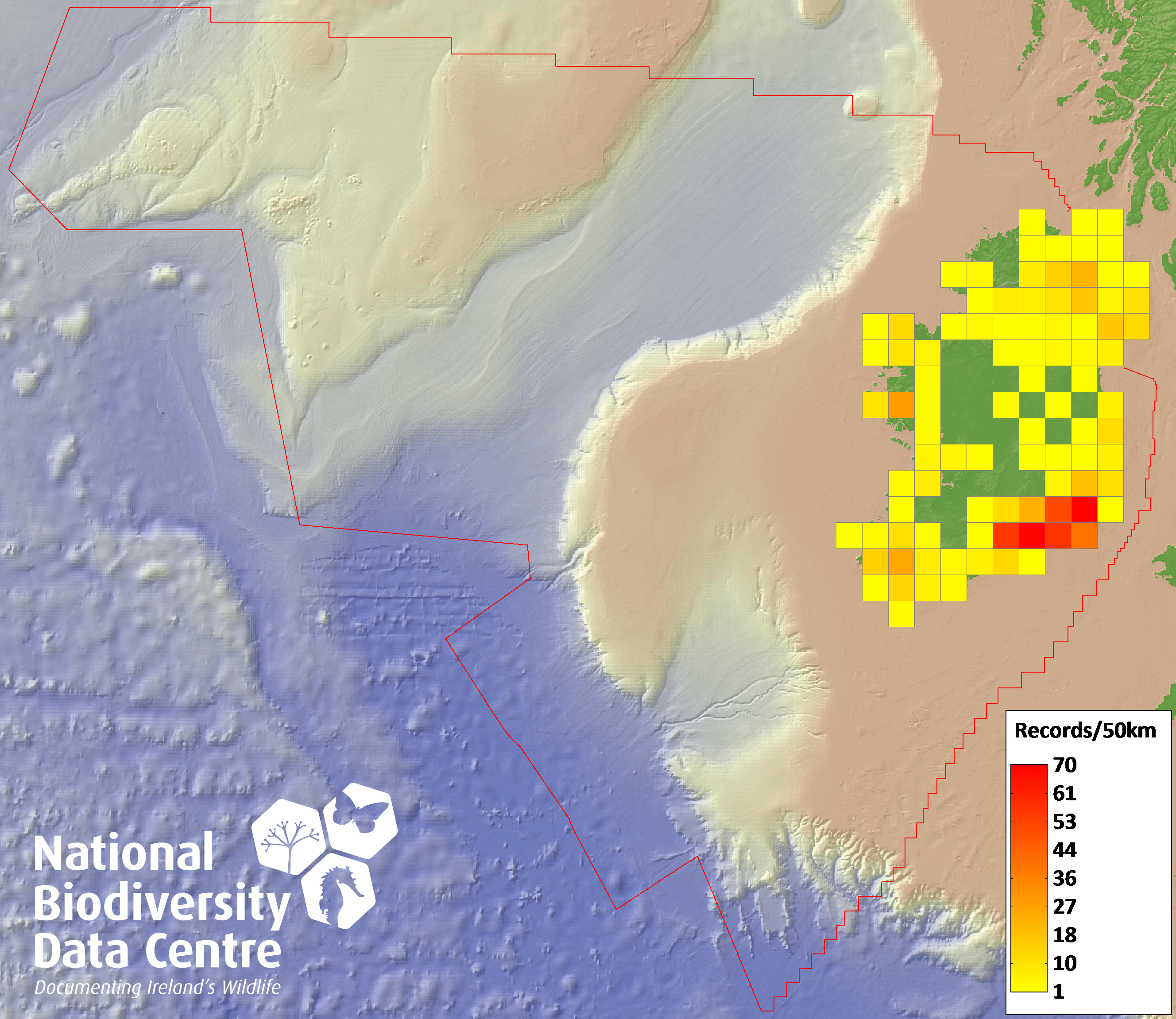 Distribution of the number of records recorded within each 10km grid square (ITM).Marine Map - 50km