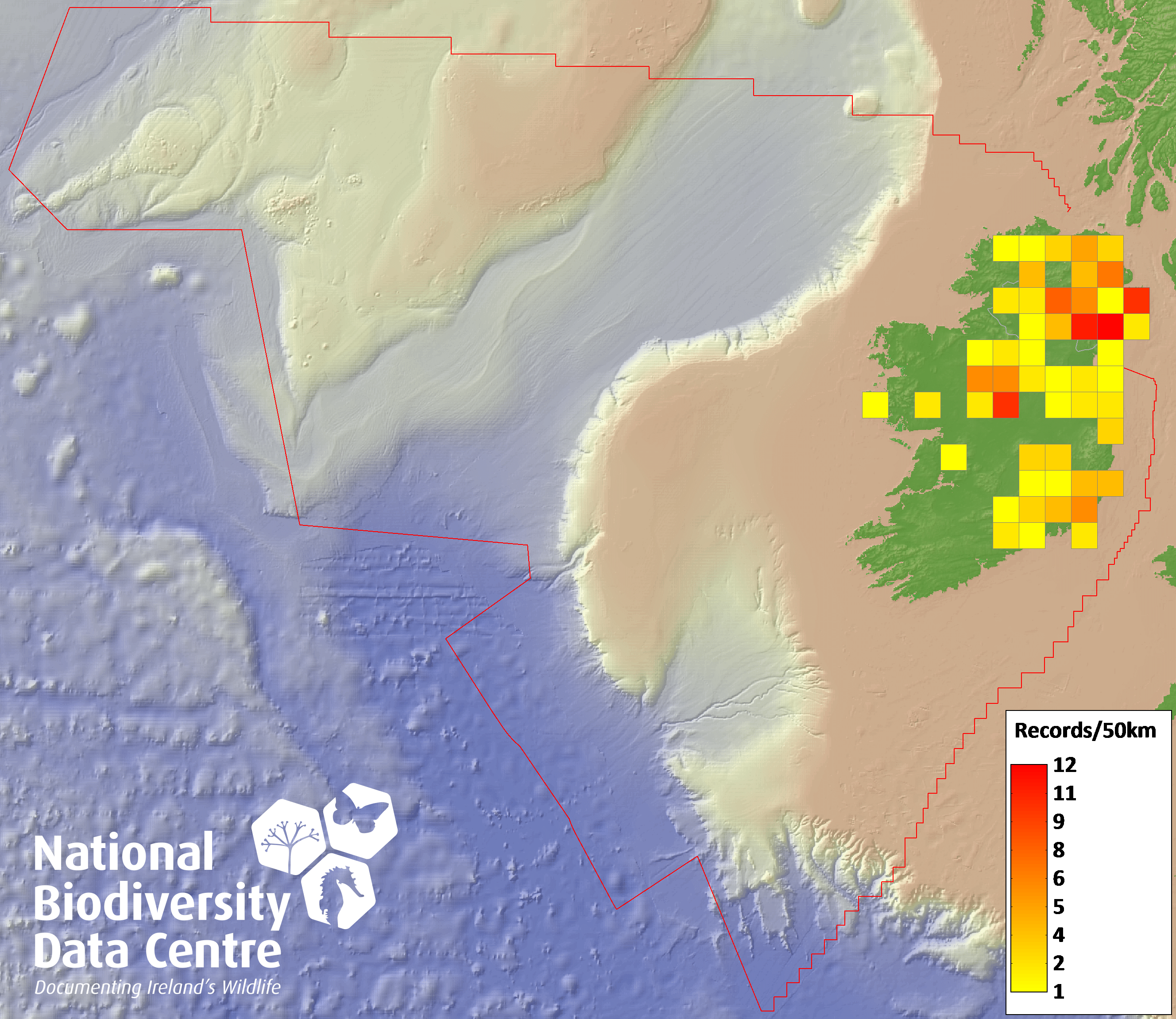 Distribution of the number of records recorded within each 10km grid square (ITM).Marine Map - 50km