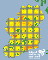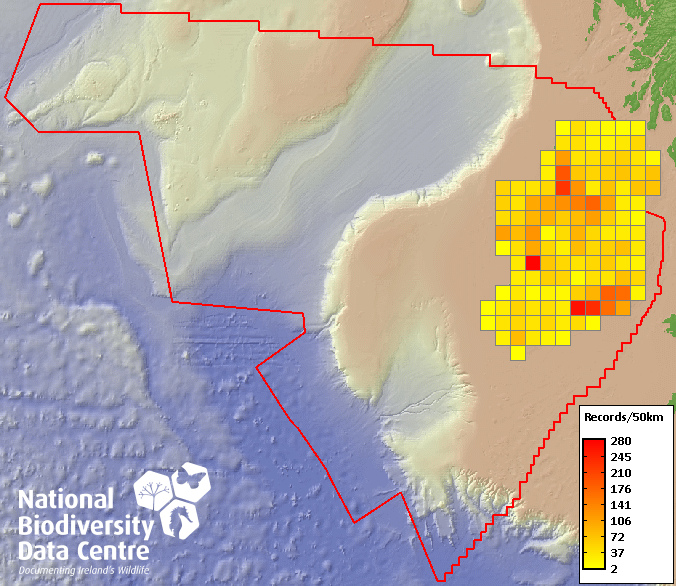Distribution of the number of records recorded within each 10km grid square (ITM).Marine Map - 50km