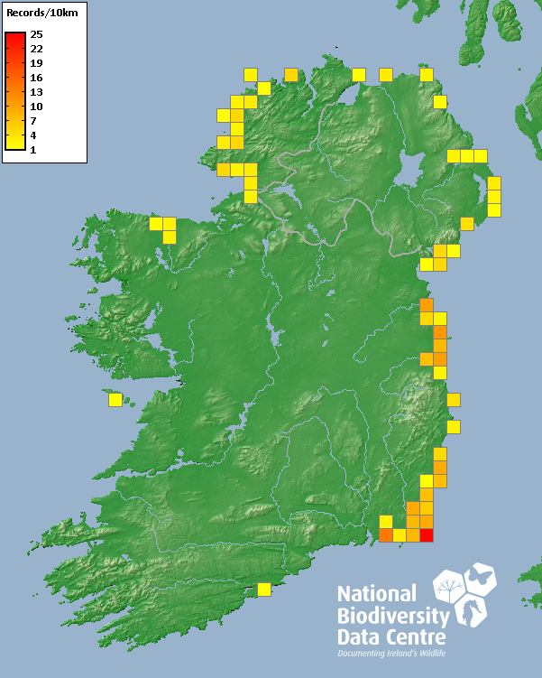 Distribution of the number of records recorded within each 10km grid square (ITM).Marine Map - 50km