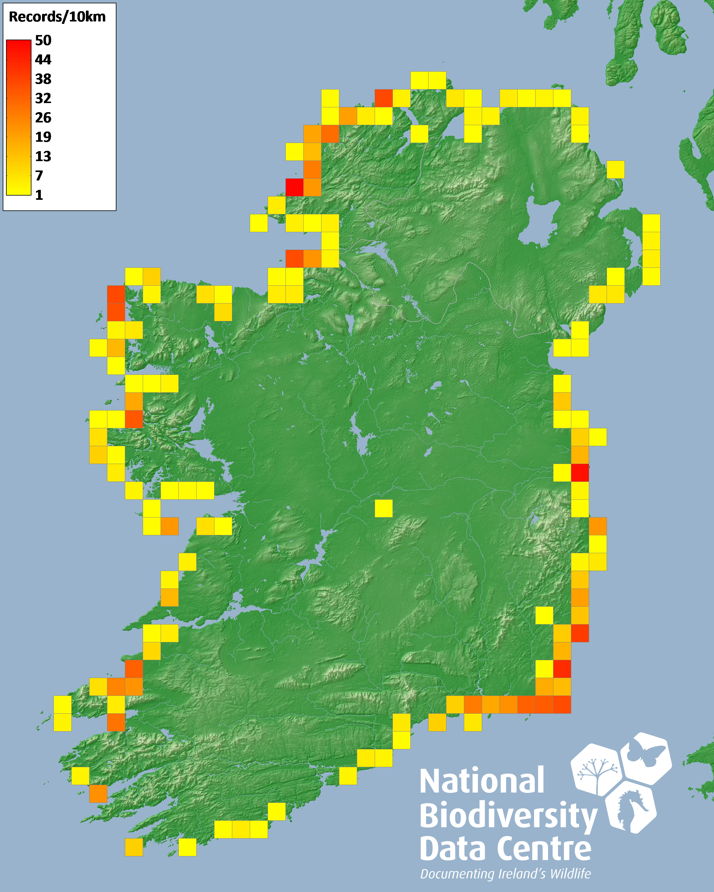 Distribution of the number of records recorded within each 10km grid square (ITM).Marine Map - 50km