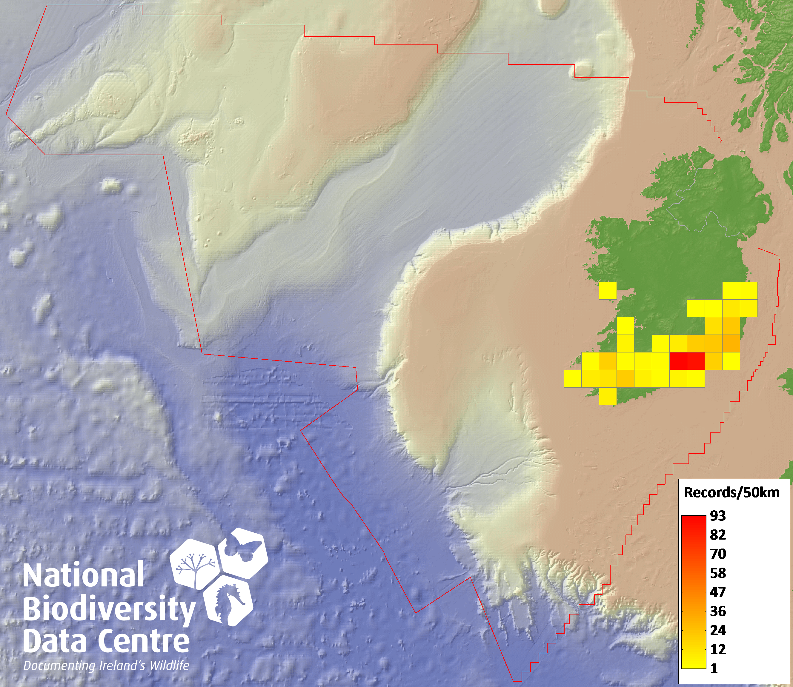 Distribution of the number of records recorded within each 10km grid square (ITM).Marine Map - 50km