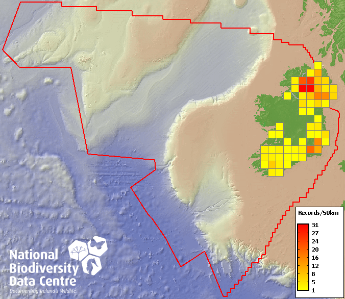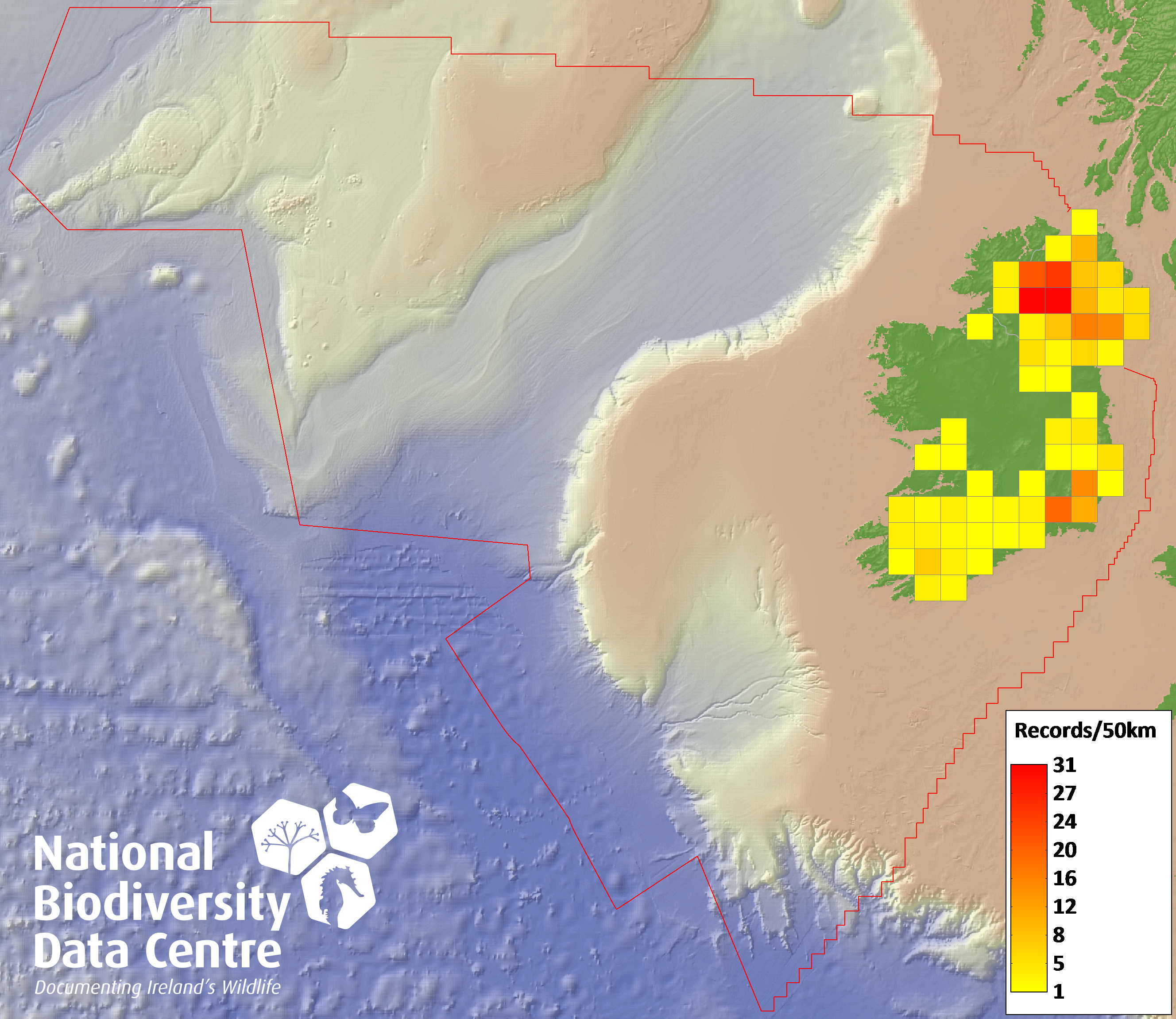 Distribution of the number of records recorded within each 10km grid square (ITM).Marine Map - 50km