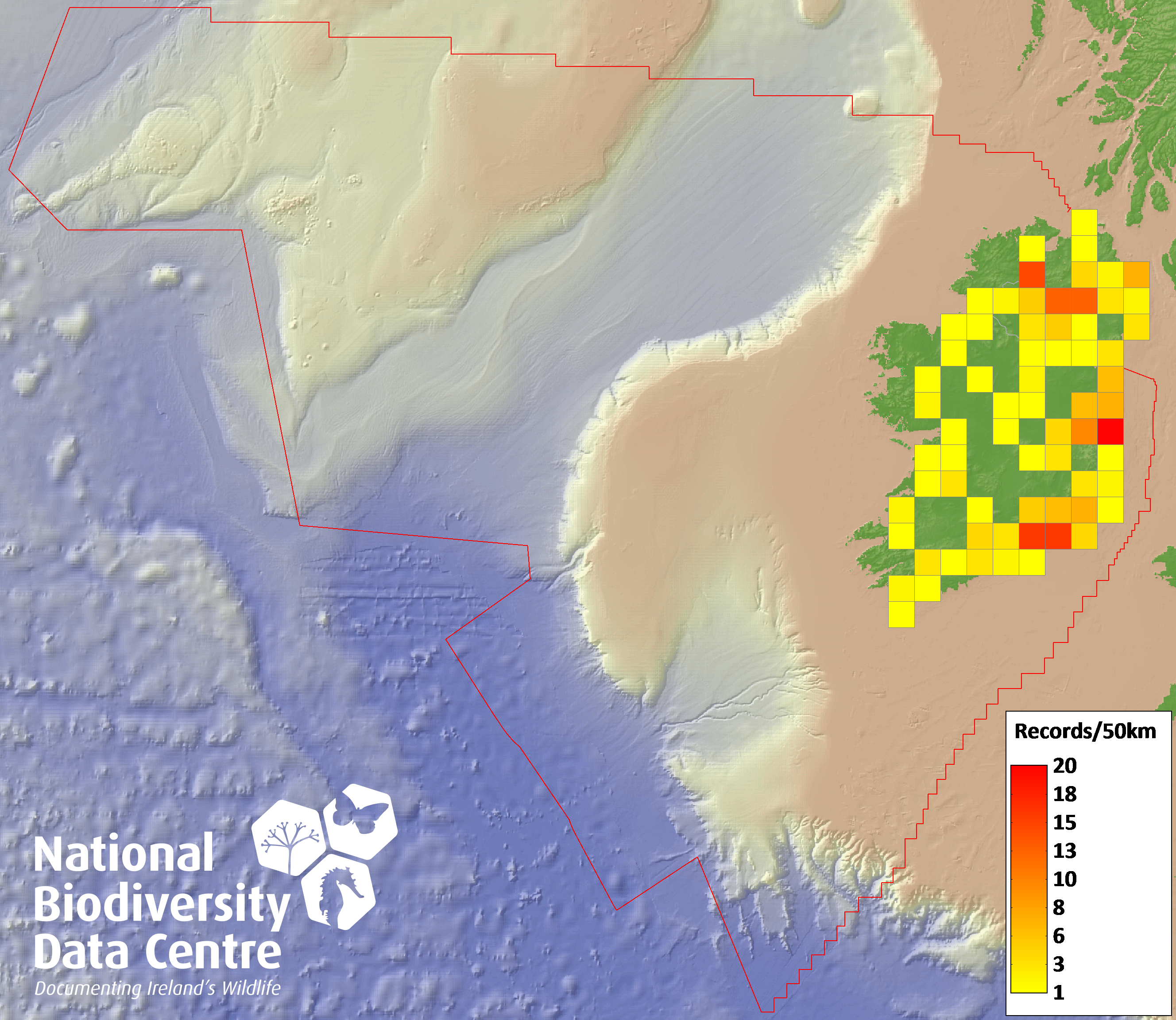 Distribution of the number of records recorded within each 10km grid square (ITM).Marine Map - 50km