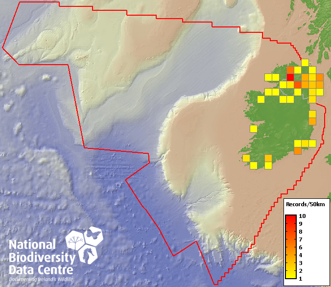 Distribution of the number of records recorded within each 10km grid square (ITM).Marine Map - 50km