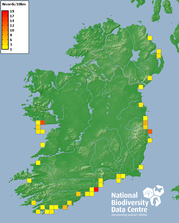 Distribution of the number of records recorded within each 10km grid square (ITM).Marine Map - 50km