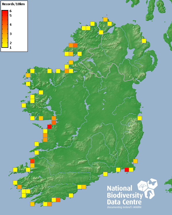 Distribution of the number of records recorded within each 10km grid square (ITM).Marine Map - 50km