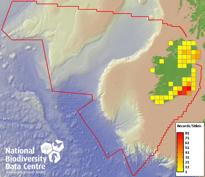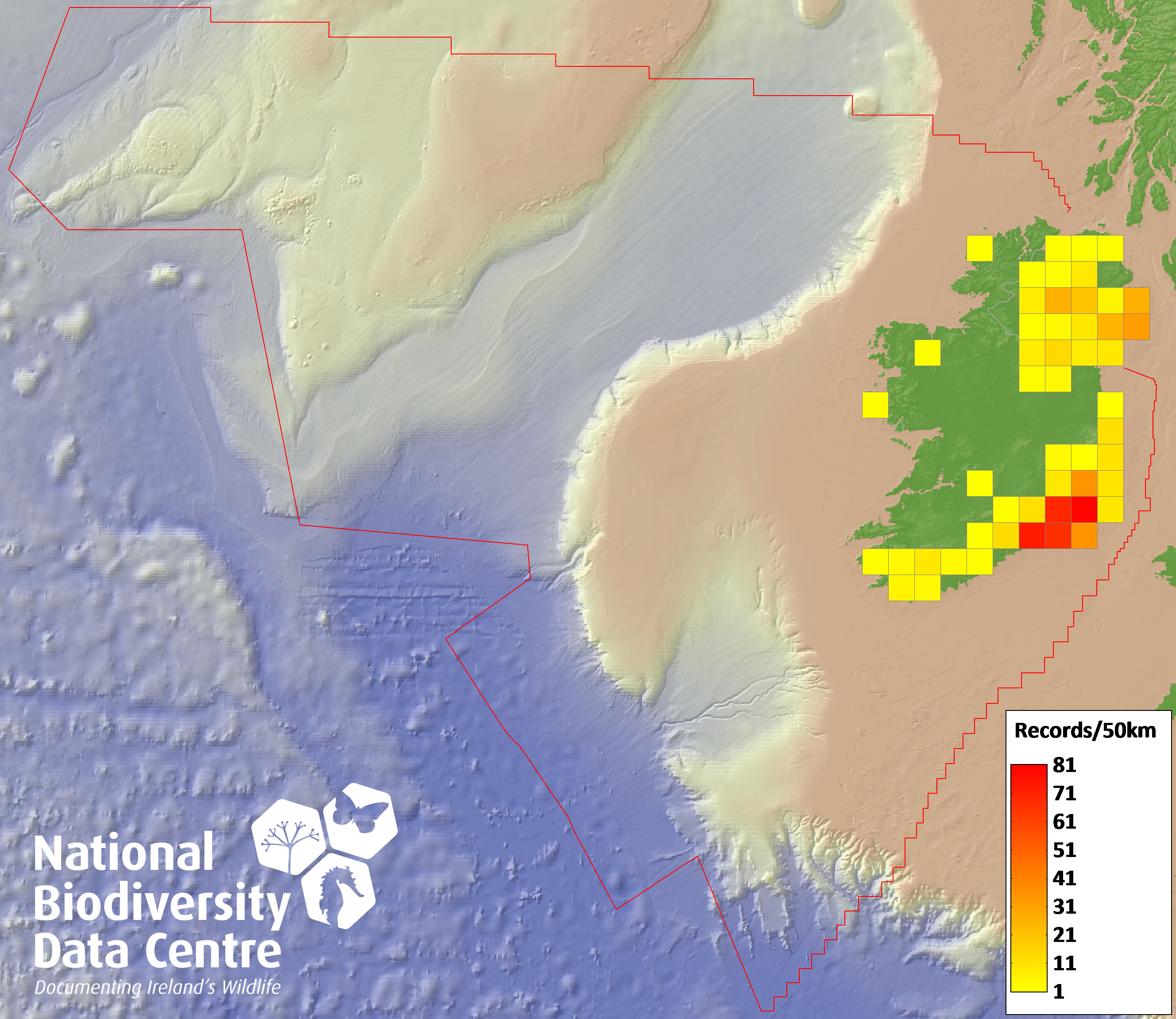 Distribution of the number of records recorded within each 10km grid square (ITM).Marine Map - 50km