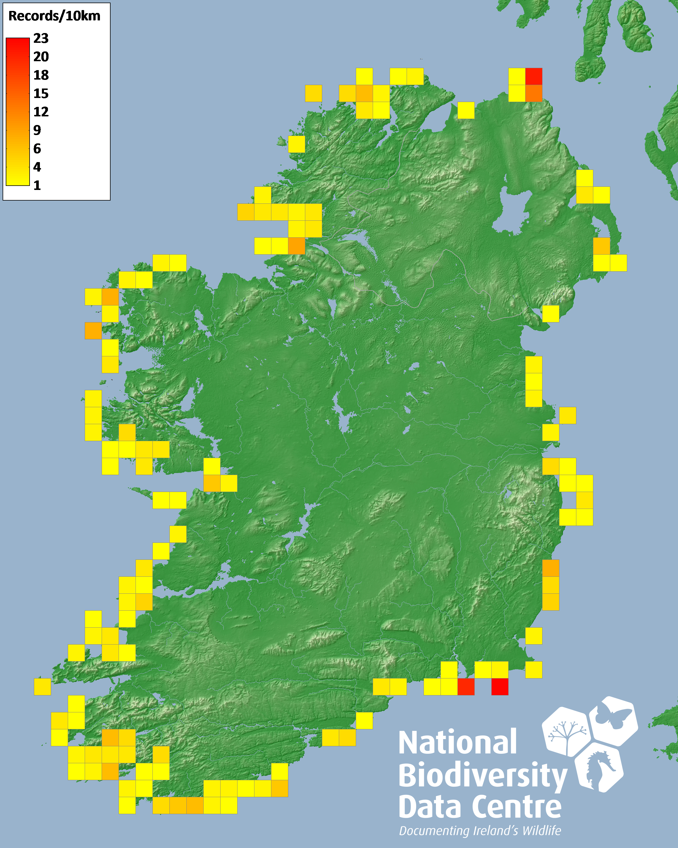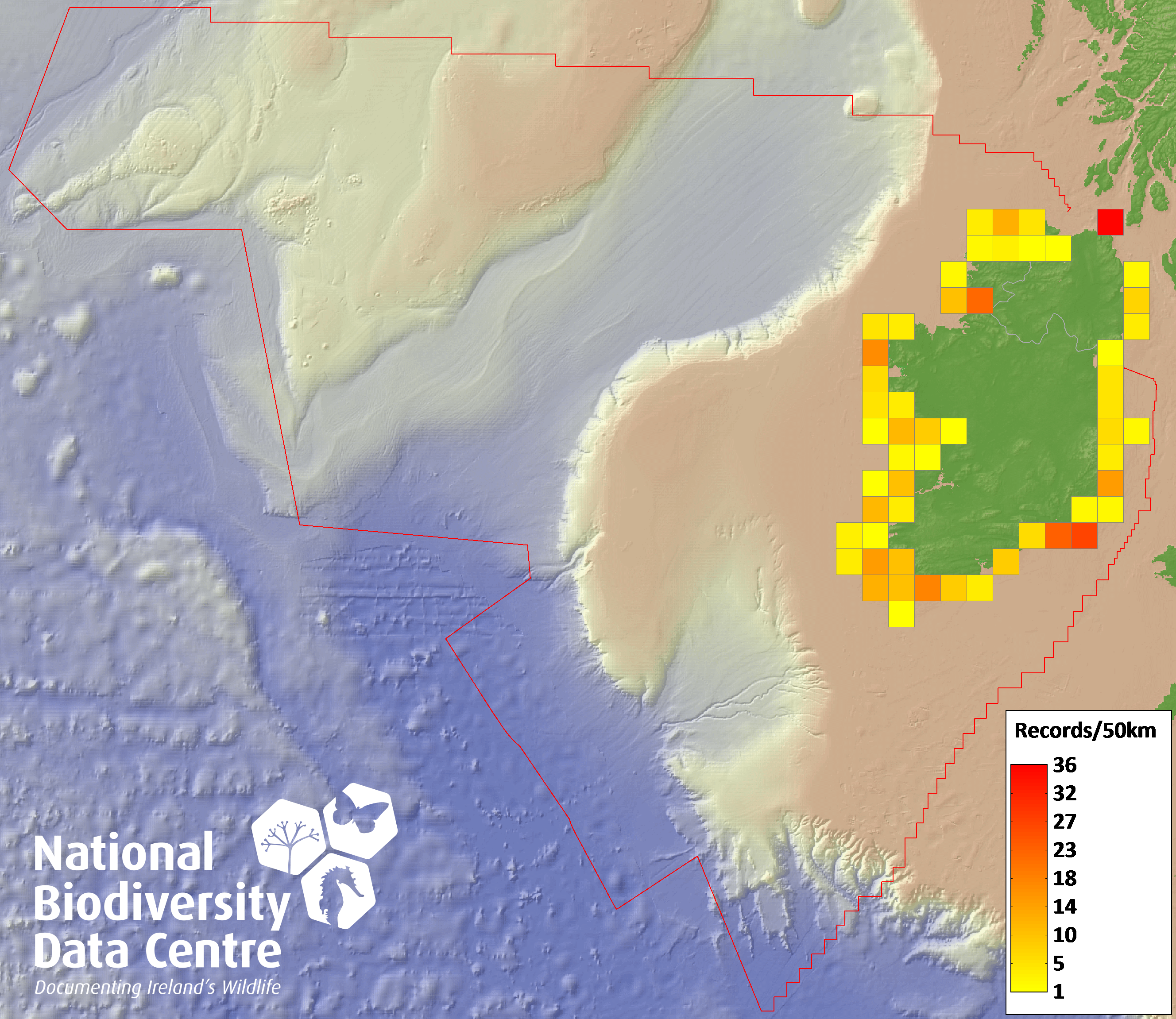 Distribution of the number of records recorded within each 10km grid square (ITM).Marine Map - 50km