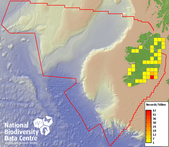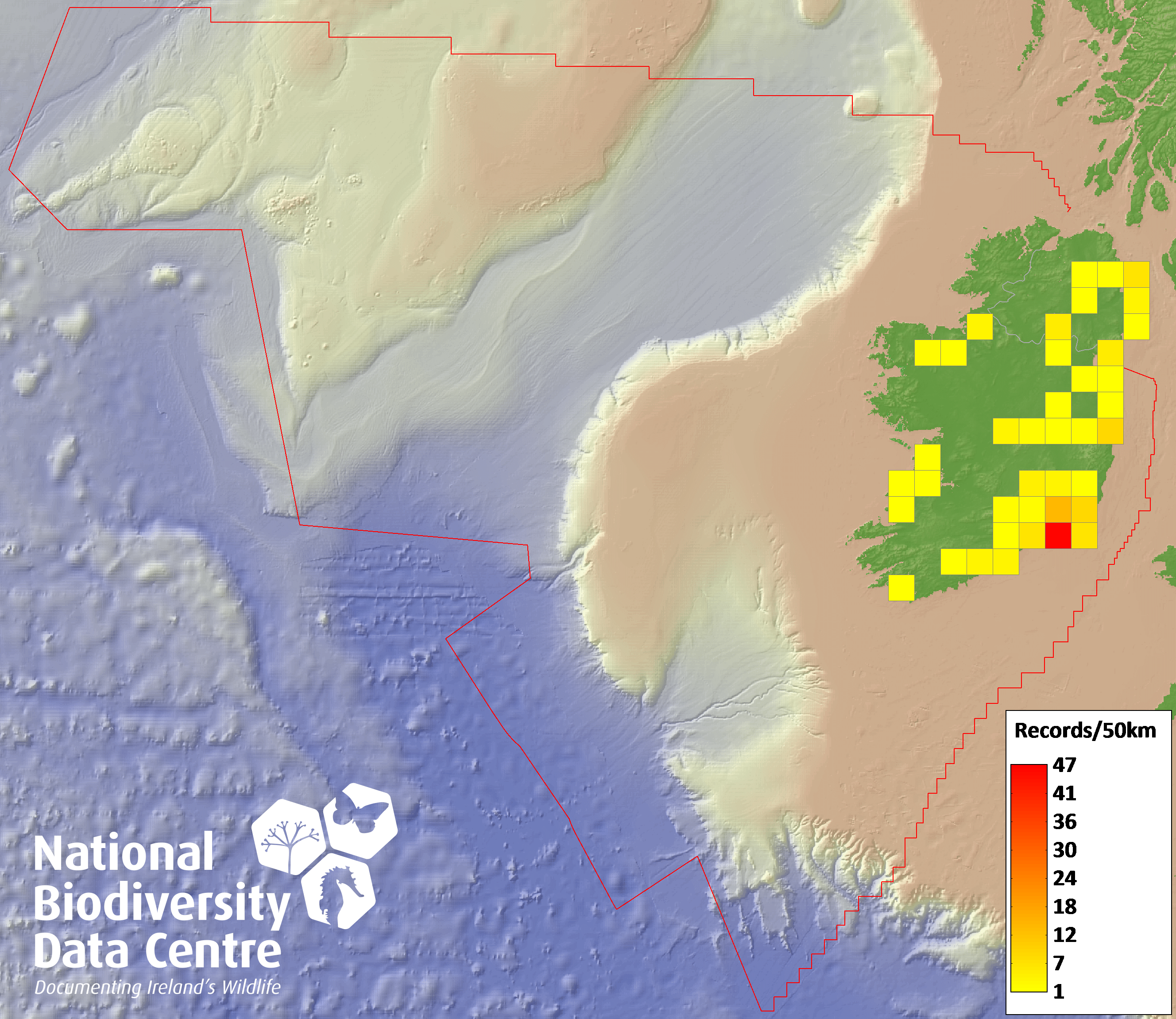 Distribution of the number of records recorded within each 10km grid square (ITM).Marine Map - 50km