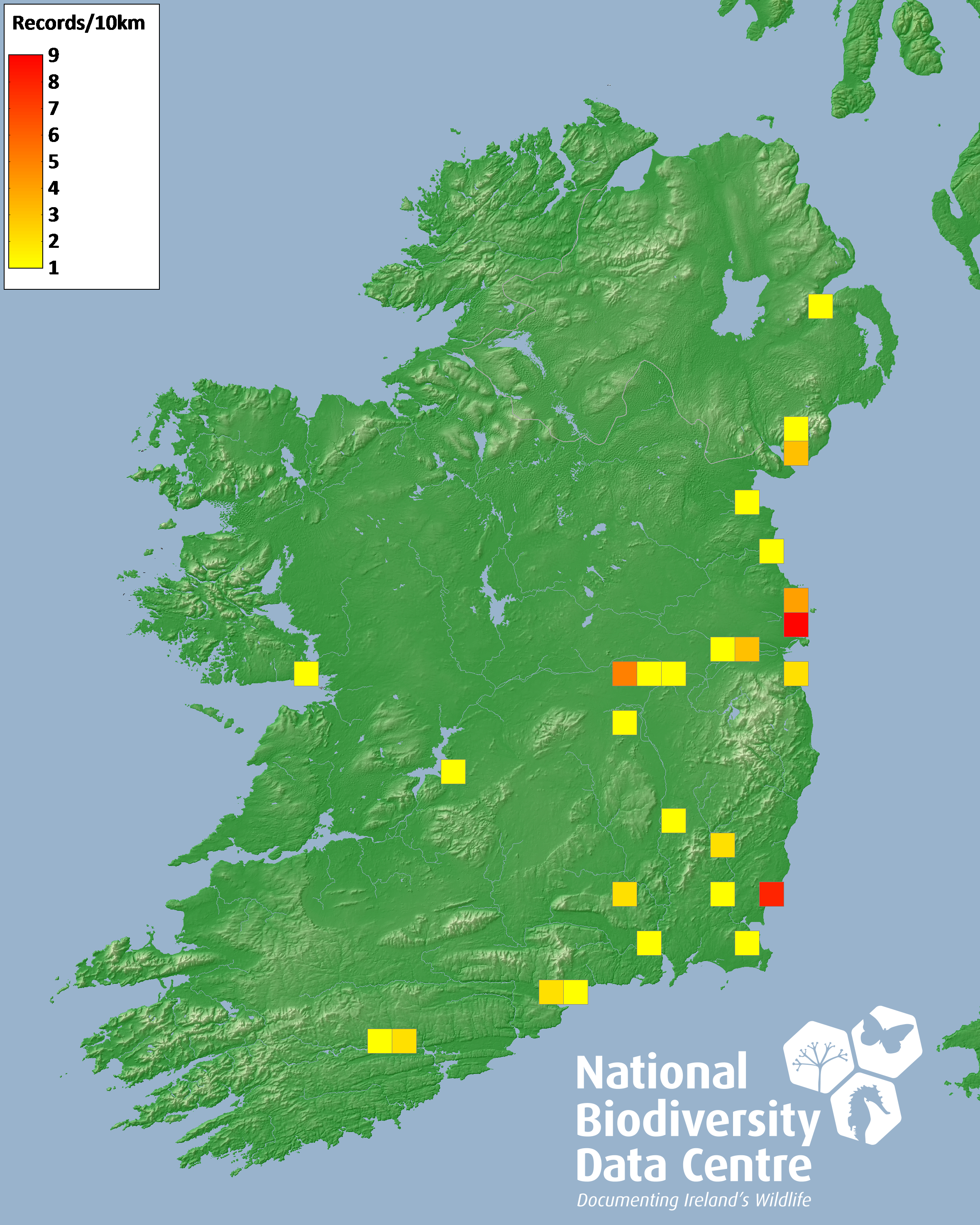 Distribution of the number of records recorded within each 10km grid square (ITM).Marine Map - 50km