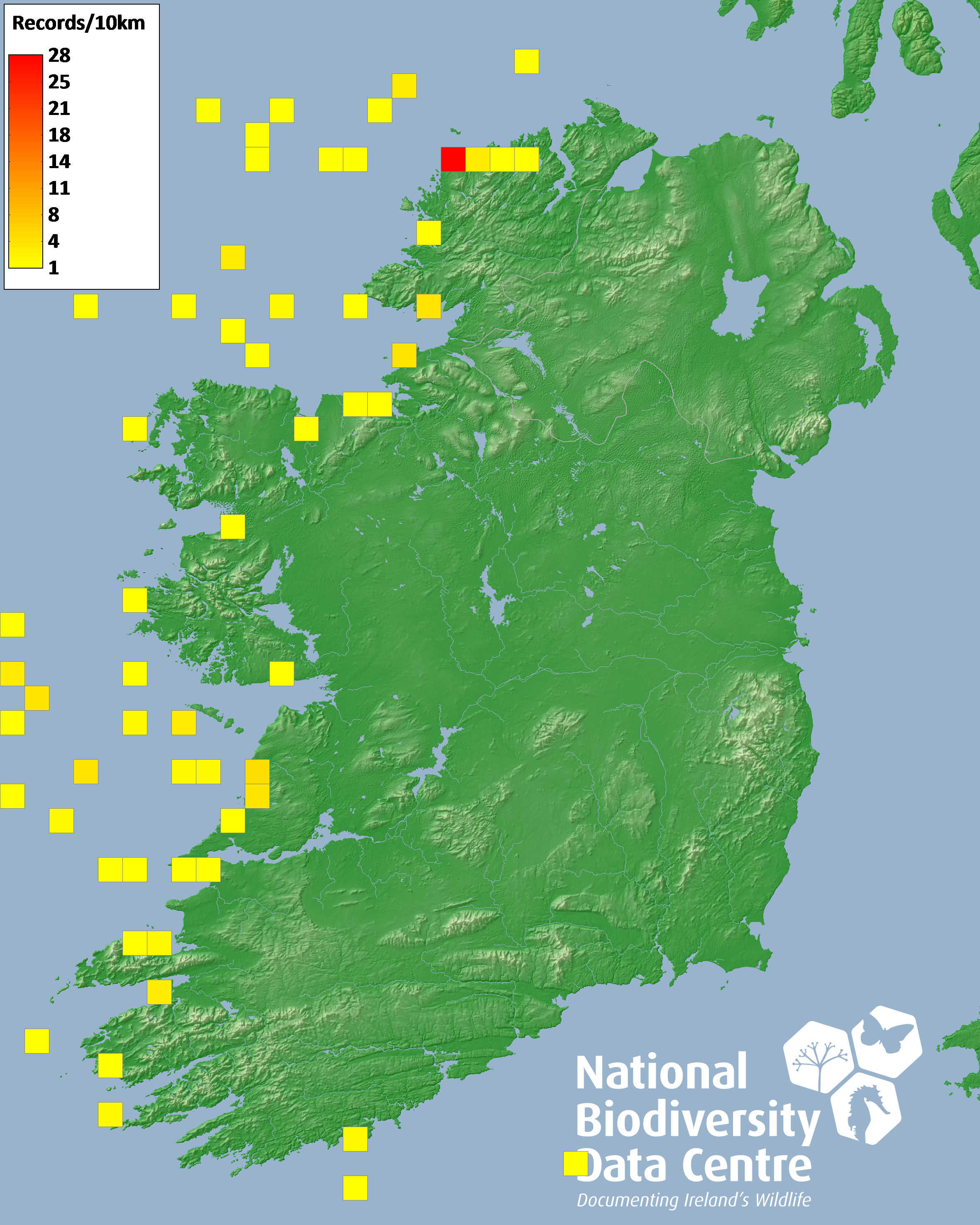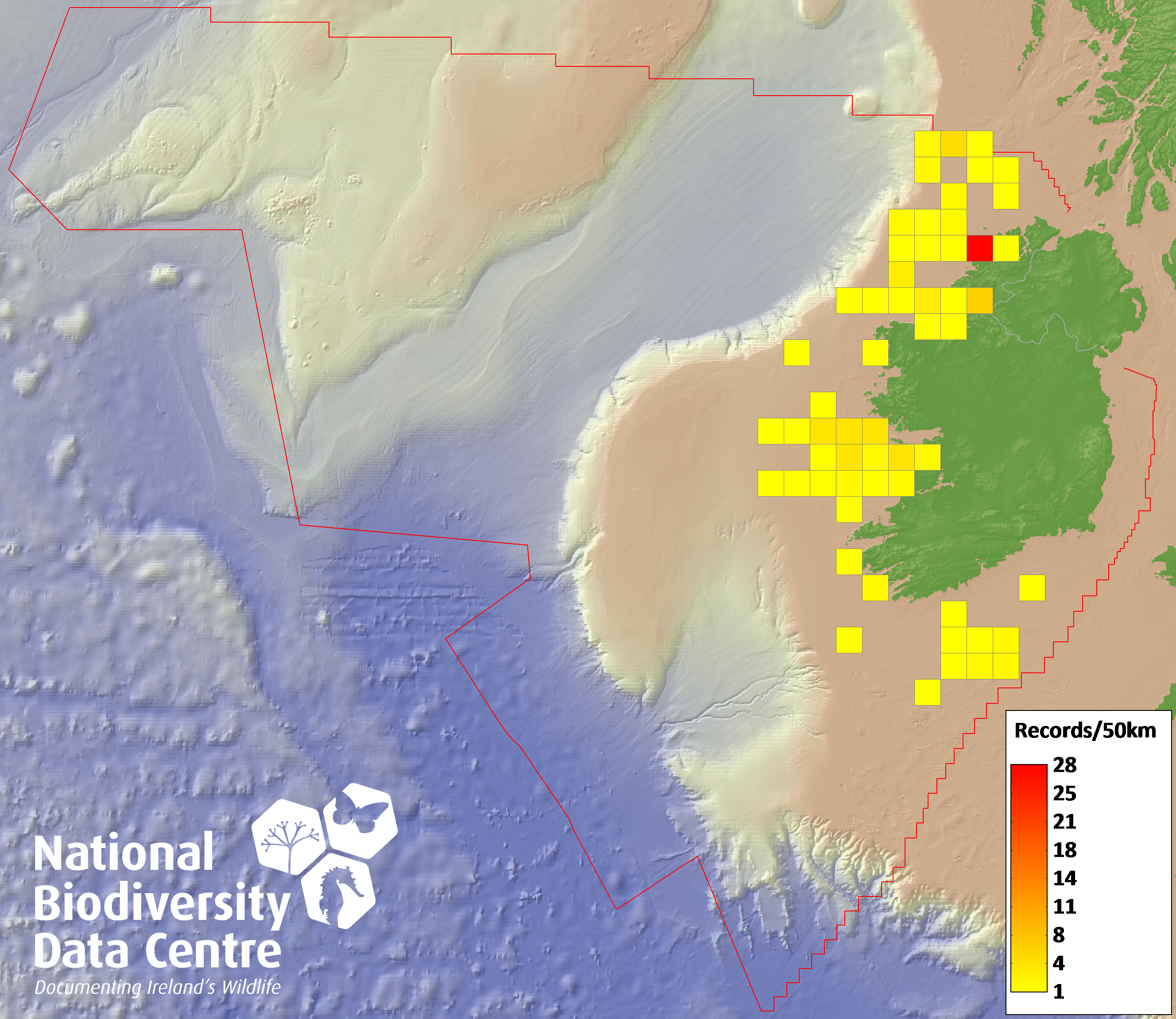 Distribution of the number of records recorded within each 10km grid square (ITM).Marine Map - 50km