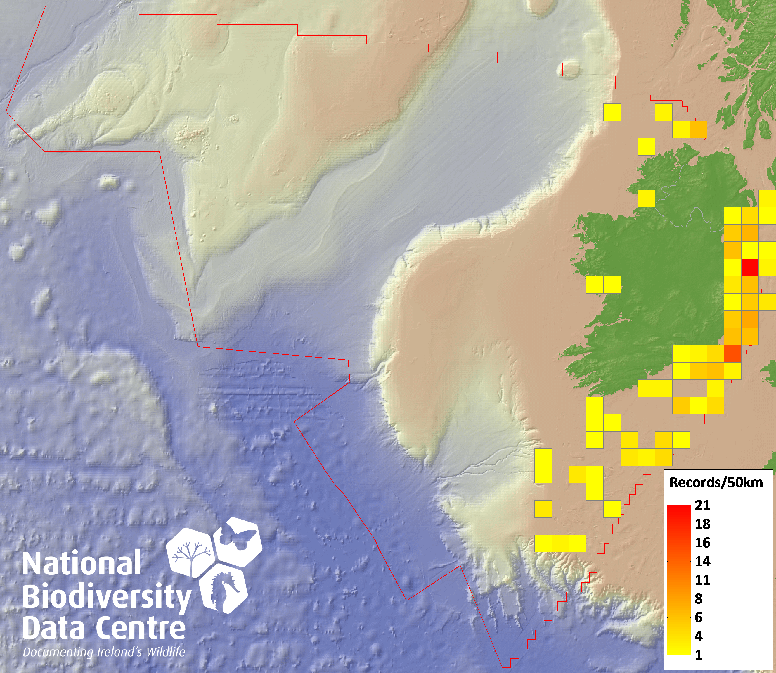 Distribution of the number of records recorded within each 10km grid square (ITM).Marine Map - 50km