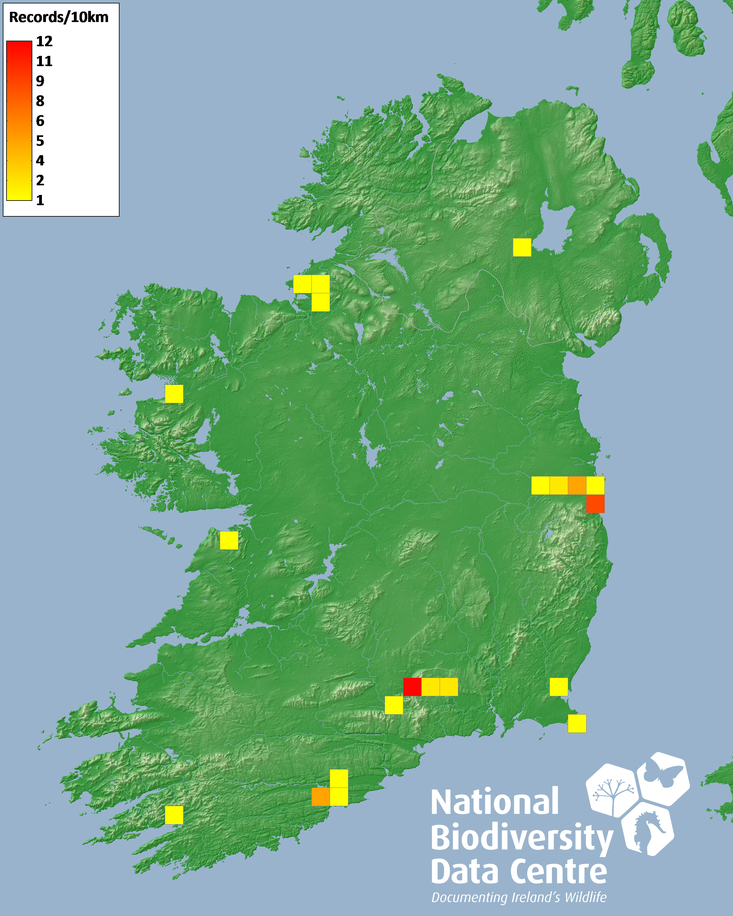 Distribution of the number of records recorded within each 10km grid square (ITM).Marine Map - 50km