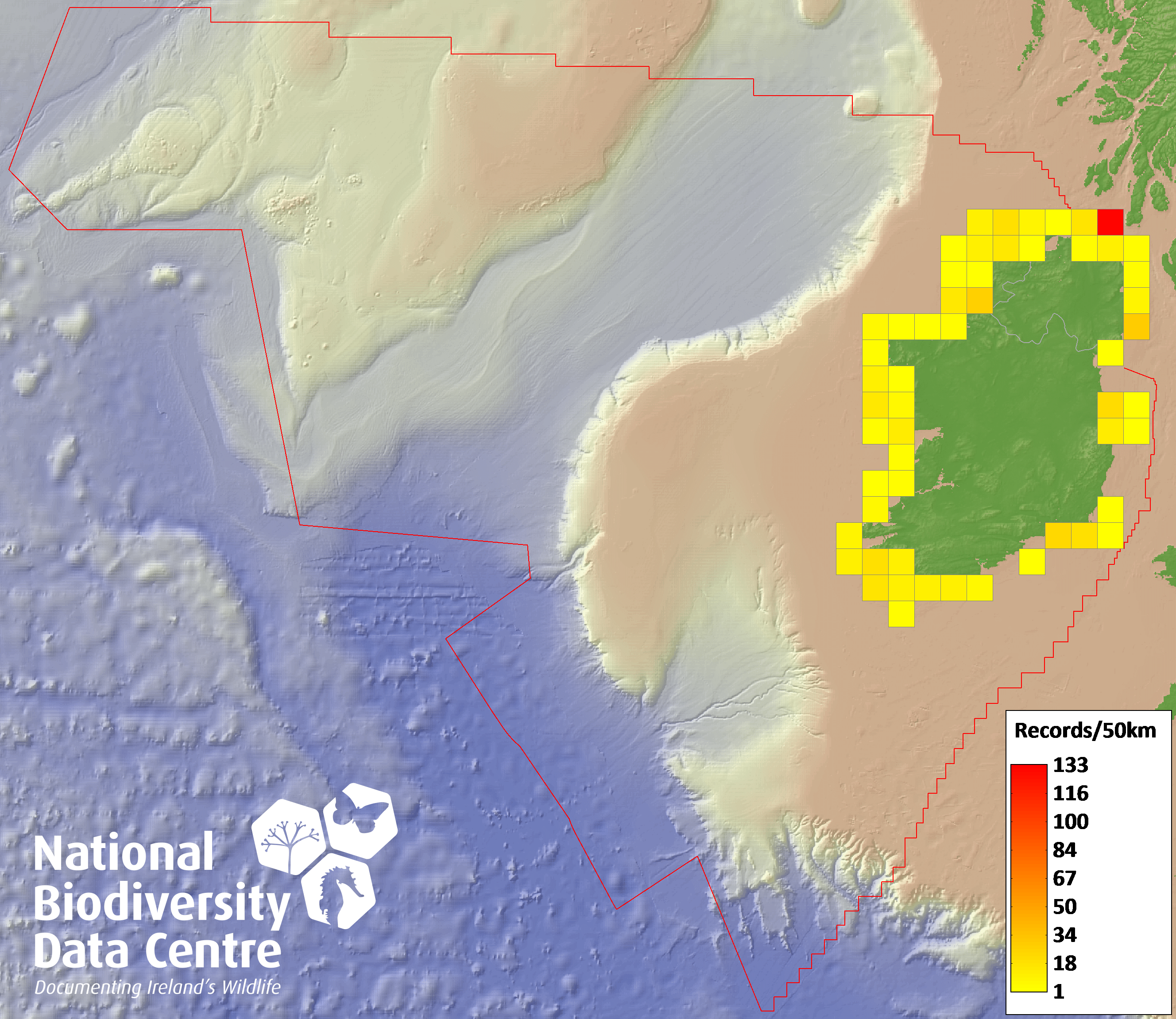 Distribution of the number of records recorded within each 10km grid square (ITM).Marine Map - 50km