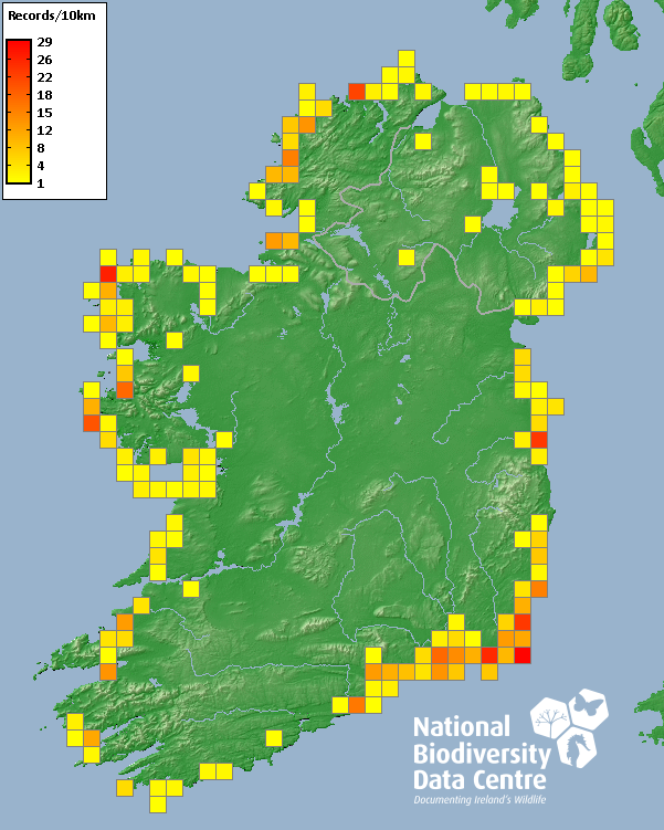 Distribution of the number of records recorded within each 10km grid square (ITM).Marine Map - 50km
