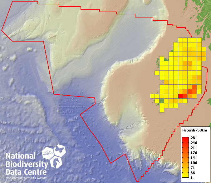 Distribution of the number of records recorded within each 10km grid square (ITM).Marine Map - 50km