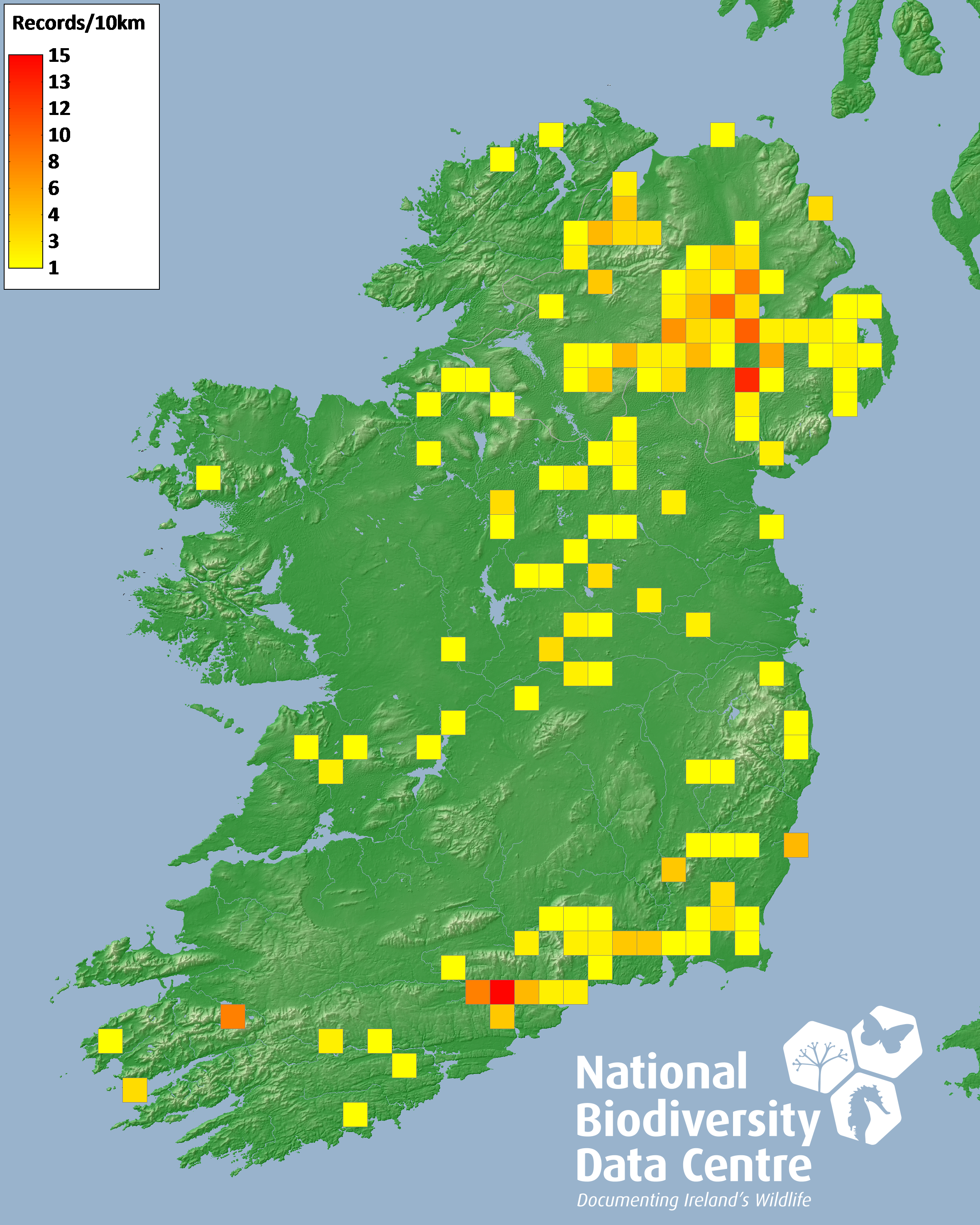 Distribution of the number of records recorded within each 10km grid square (ITM).Marine Map - 50km